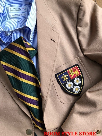ユニクロの商品の中で評価の高いオックスフォード地のボタンダウンシャツ。その背景にユニクロ会長の実家がVANショップを経営していたことが関係しているのは間違いないと思うが、写真のシャツもVAN出身だった末貞会長が興した鎌倉シャツの逸品だ。今、VANに合わせたいシャツといえばこの鎌倉シャツが一番。誰よりもVANのことをよく分かっていると思う。VANのノベルティにも似たエンブレムは英国製、ピンで後付している。