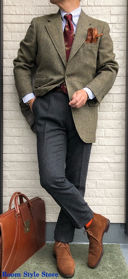 ロンドンを初めて訪れたのが1991年。日本のハケットで下調べをしていざニューキングスロードの本店へ…と思っていたらピカデリーにHACKETTの店があるのを見つけてしまった…だがよく見ると店舗はコーディングス???…なんと店の一部をハケットが間借りしているのだった。おかげで名店コーディングスとも出会えた実り多き初渡英だった。写真はハケットが日本から撤退して英国物が手に入らなくなったのでコーディングスにメールオーダーしたジャケット。靴も同じくクロケットから取り寄せたロシアングレインの外羽根Peebles。鞄は万双のブライドルトート。