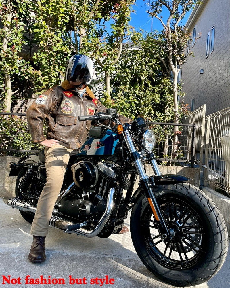写真のアヴィレックスG-1はかなり年季が入っている。自分で着古すのは大変だが、幸い古着を買ったので色落ちや擦れ具合は十分。ライディングスタイルも様になる。袖のリブ編みは少々やれているが身を包むような安心感は健在だ。インナーをデニムシャツに交換。ストレッチ機能の付いたカーゴパンツに替えて足を動かし易くしてみた。