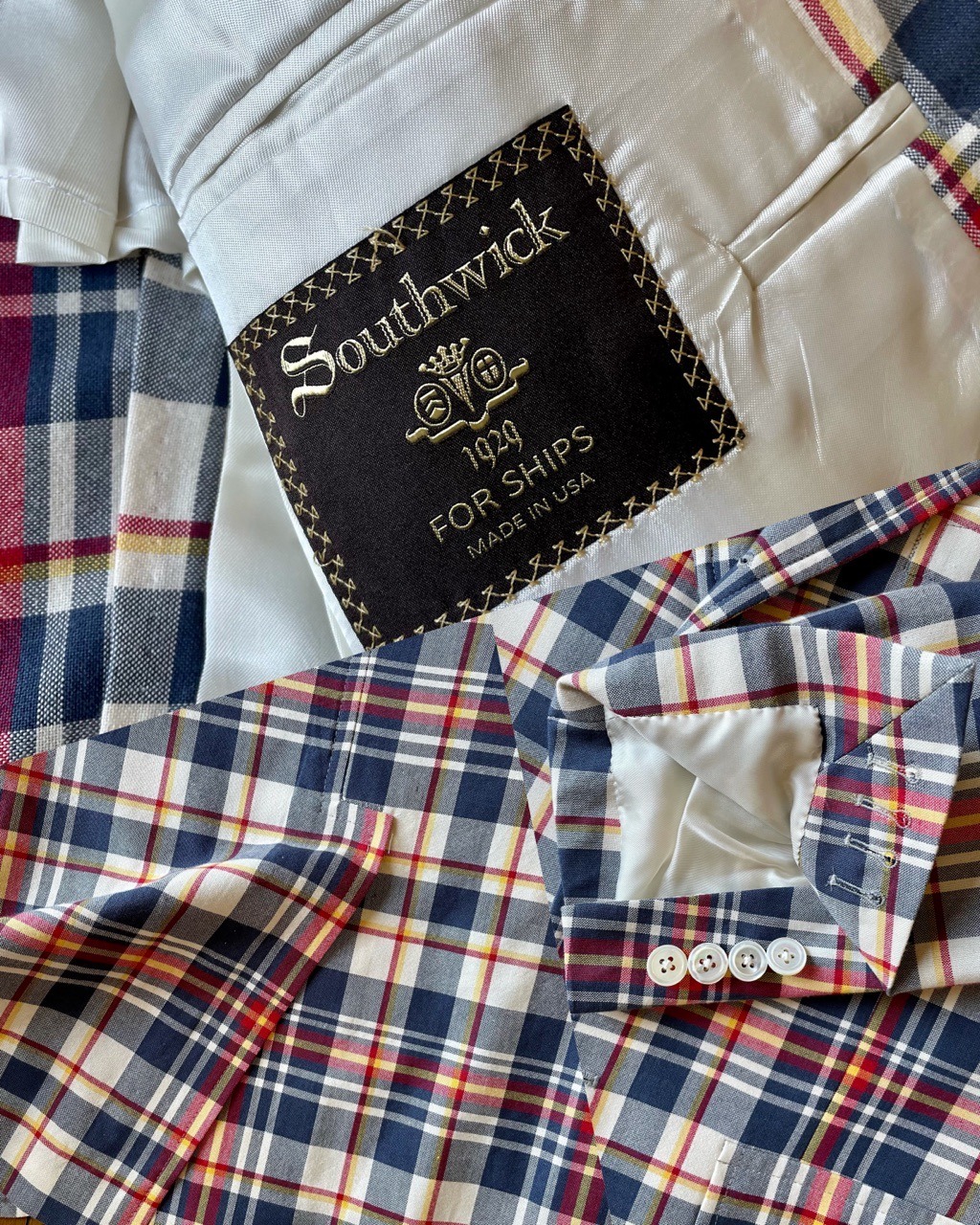 こちらは同じ生地で作られた4ピース。ブルックスブラザーズ200周年記念展で撮影したもので、トムブラウンのディレクションによるブラックフリースの製品になる。ブルックスブラザーズ傘下のサウスウィックが製造したこのジャケット、当ショップの主宰若林も着ている。同じ生地で作られたジャケットを二人とも着ているということがRoomのスタイルを物語っている。 (3)サウスウィックの行方