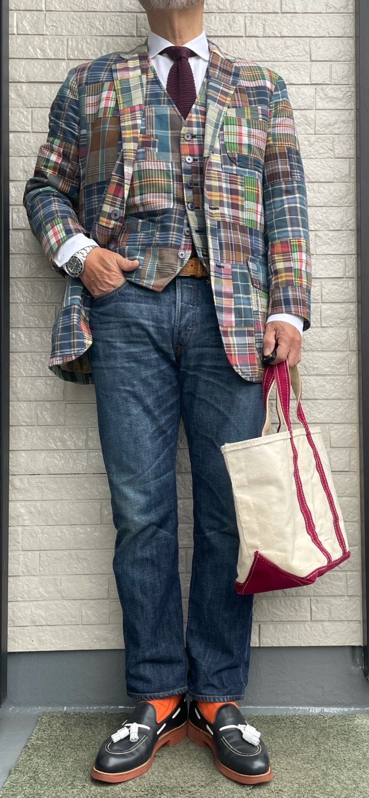 クラシックマドラスからパッチワークのベストと上着に交換、シャツと靴もついでに交換してみた。ネイビーのタッセルスリッポンはクロケット製。トムブラウンがいた頃のブルックスで買ったもので今よりずっと華やかさがあった。ジャケットとヴェストは共にラルフローレン。