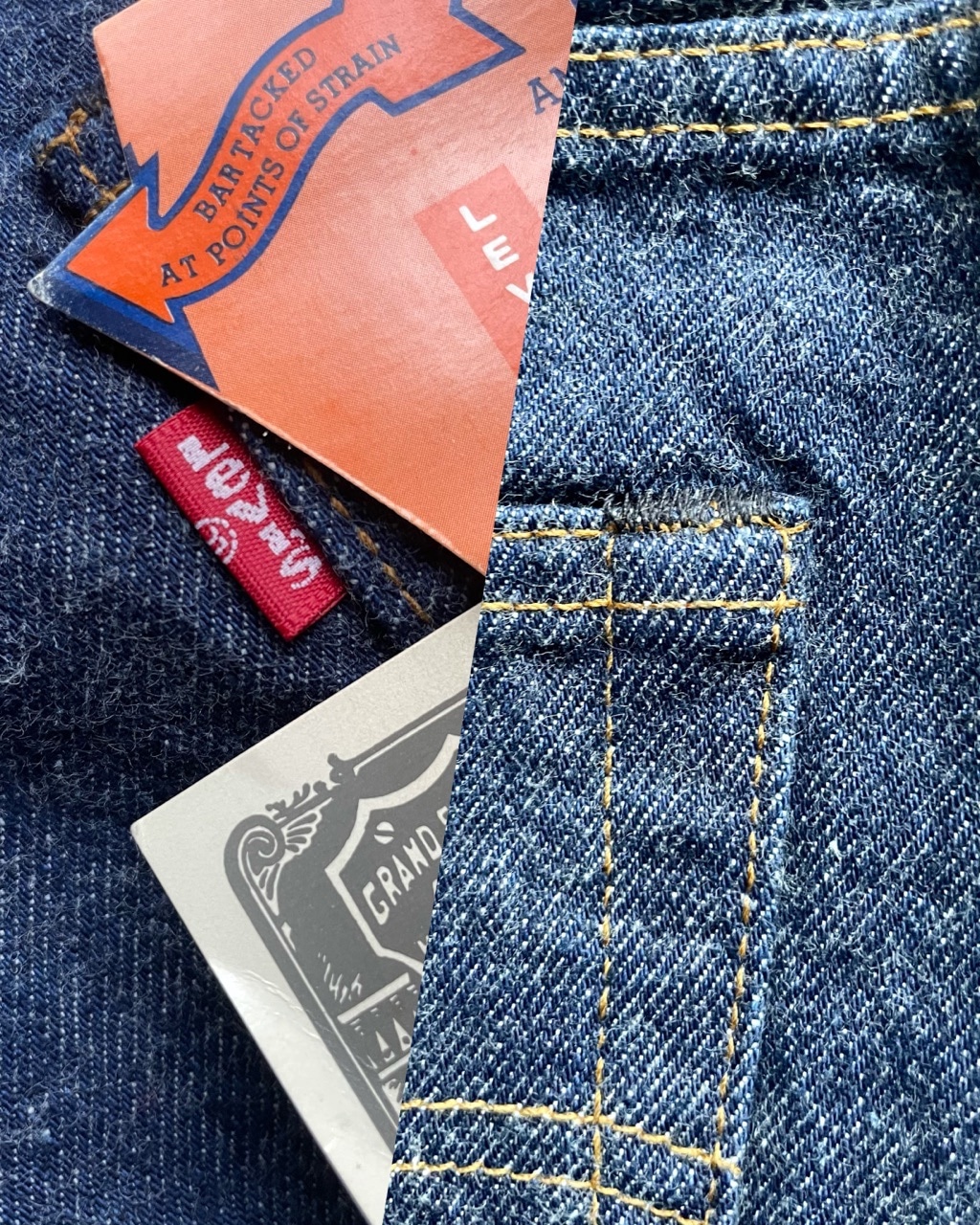 アウトシームは赤耳。その有無で価値が大きく異なる部分だ。裾上げはチェーンステッチでインシームがシングルステッチとチェック項目をこなしていく。デニムは毛羽立ちのある生地感。因みに店内には赤耳なしの脇割りモデルもあったが価格は随分開きがある。調べてみると83年に赤耳生地が生産を終え、幅広デニムが導入されると赤耳モデルと脇割モデルが混在し、86年には全て脇割りモデルになったようだ。