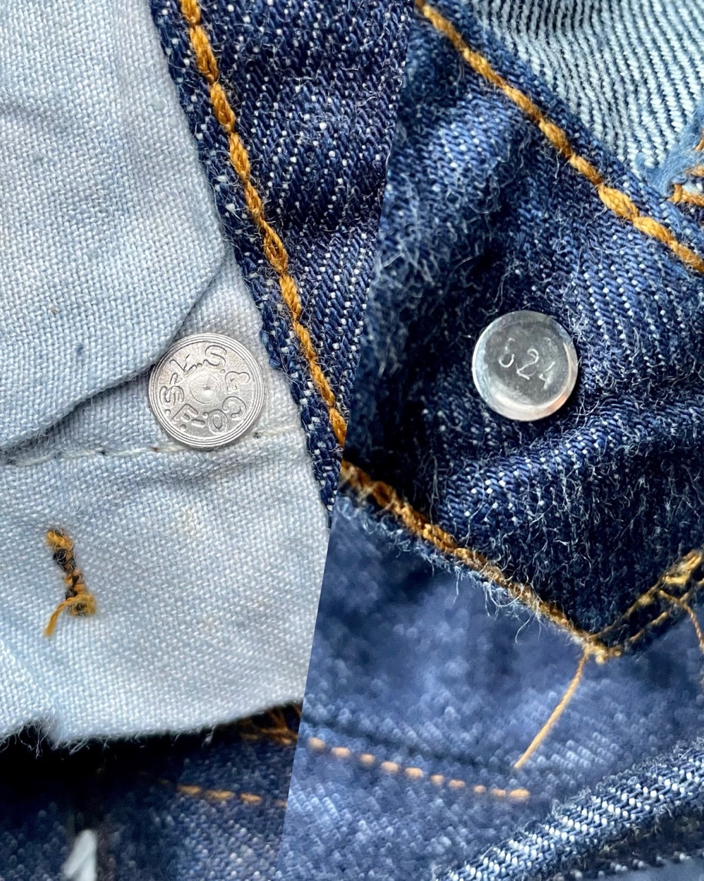 トップボタン裏の刻印は524。エルパソ工場製を示している。リベット裏はアルミ製でLS&CO SFという文字の外側に同心円が彫られている。70年代や80年代後半はプレーンな表面にLS&CO SFになっている。こうしたディテールの違いを丹念に調べたビンテージマニアの知識が集積されたネットの世界を検索すると本当に色々なことが分ってくる。