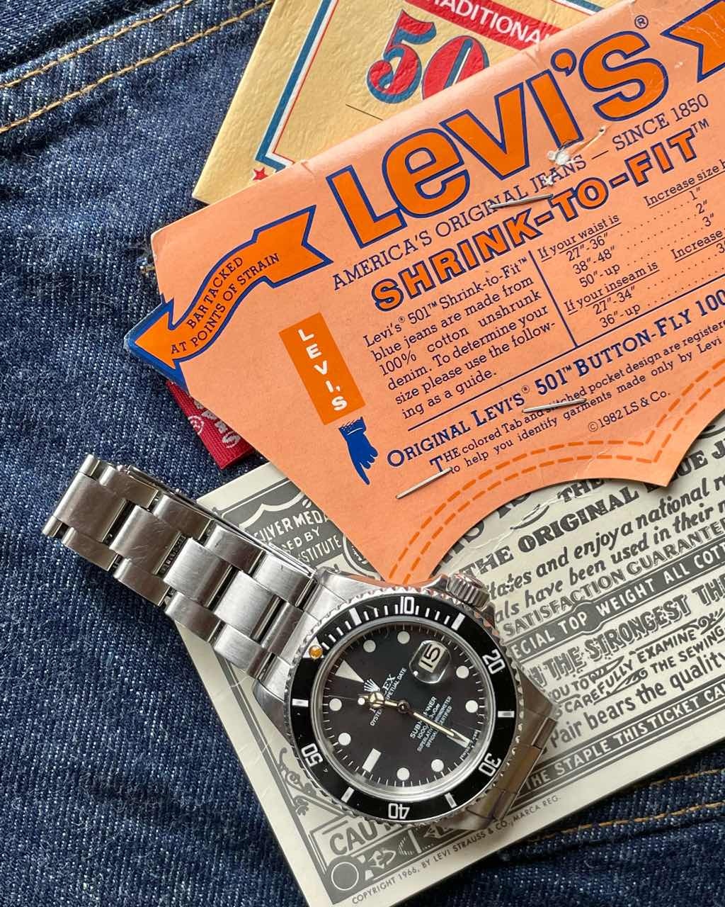 こちらはサブマリーナ。1680の後継16800は1980〜1986年に製造されたもので、写真は文字盤のインデックスに縁が付がない前期型。なので恐らくは1983年頃のものだろう。もしかすると今回のリーバイス501と同じ歳かもしれない。これに同年代のチャンピオンリバースウィーブのスエットでも着て80年代にタイムスリップしたようなコーデをするのも楽しそうだ。