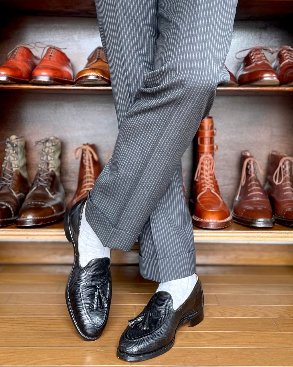 黒のリザードスリッポンにグレーのウールパンツとソックスのトリオ。昔銀座のラルフローレンに行くと靴コーナーに鎮座していた黒と茶のリザードスリッポンがいつも気になっていた。日本製靴のライセンス品だったがその時にリザード=タッセルスリッポンがインプットされたに違いない。店に入って試着「お買い上げ」まであっという間だった。