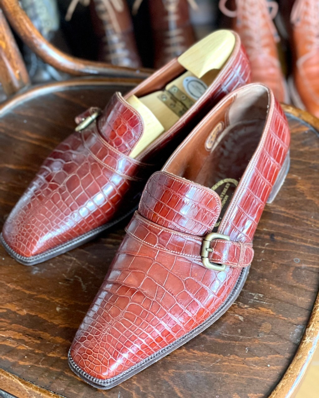 アリゲーターやクロコの靴は独特の紋様と透明感のある色目が特徴。特に竹斑と呼ばれる四角い部分はスケールが大きくなると遠目にもはっきりと分かる。グラスゴーは切り返しの少ない「シンプルなデザインが良い。」と力説していた。革の配置も斑の小さな部分をつま先に配し、徐々にスケールが大きくなるようパターンを取るとのこと。なるほど1足目は基本に忠実な仕上がりのようだ。