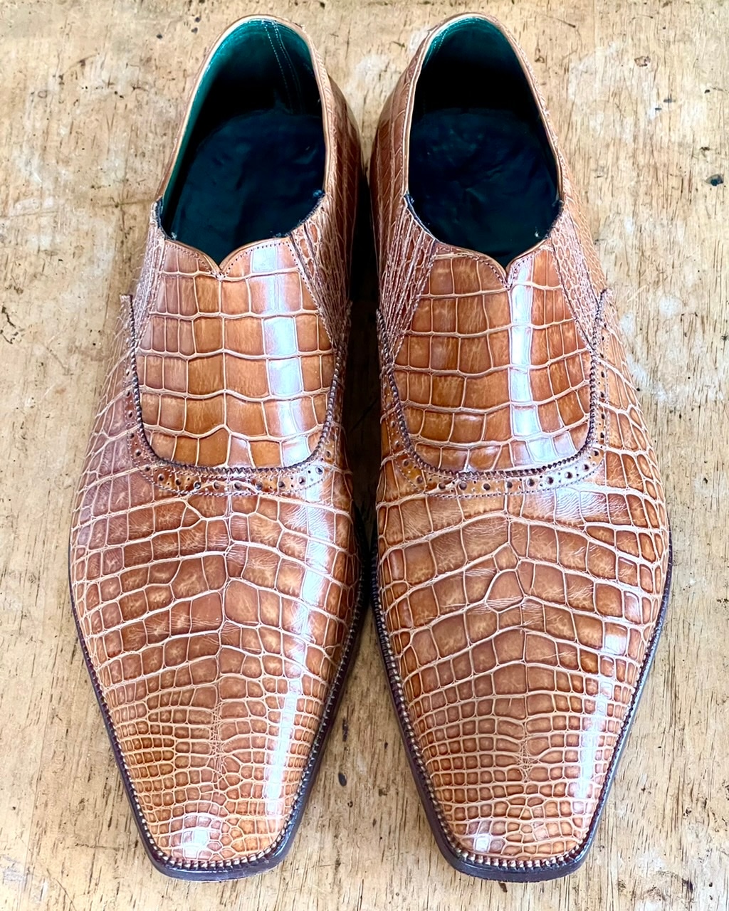 出来上がったアリゲーターのサイドエラスティック。透明感のあるアメ色や小から大へと大きさを変える斑の美しさも相まって存在感は強烈だ。ドレススタイルには印象が強過ぎるすので専らカジュアルな服を合わせているが、アリゲーター(クロコ)の靴は春~夏の日中に履く靴、シーズンスタートの春に相応しいコットンスーツに合わせるのも悪くない。
