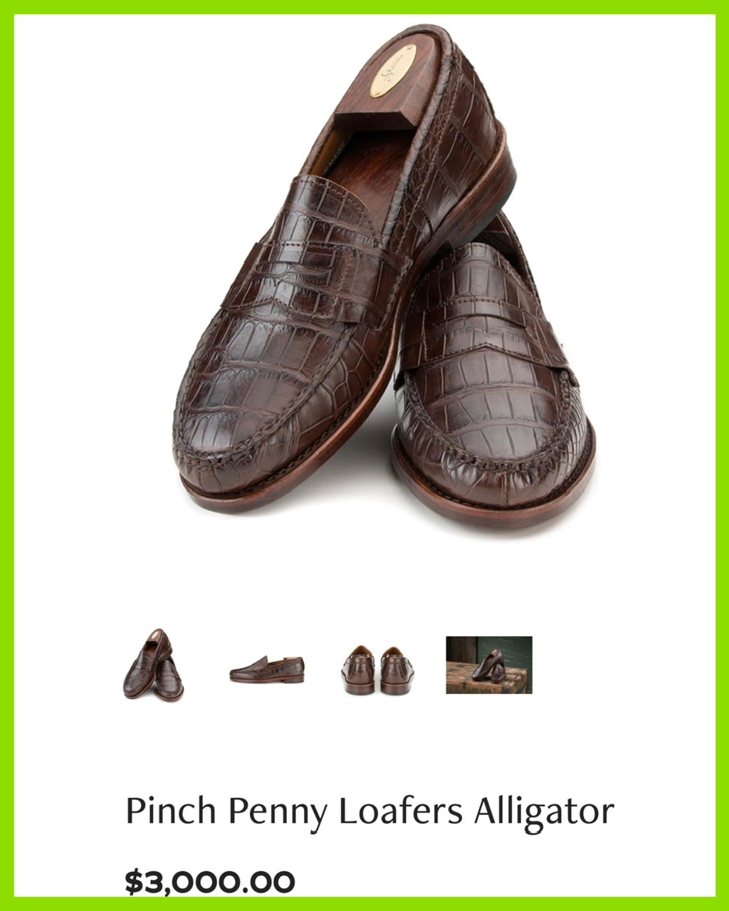 靴の印象を決めるアウトサイドはパーツを一枚革で、見えにくいインサイドはサドル下で繋ぎ合わせる。見栄えの良さとワニ革の有効活用を両立させている。サドルの端をハンドで縫い合わせたデザインはピンチ(Pinch:挟み込むの意)ペニーと呼ばれるもの。ちなみにこの靴、注文後6週間から8週間で完成するそうだ。