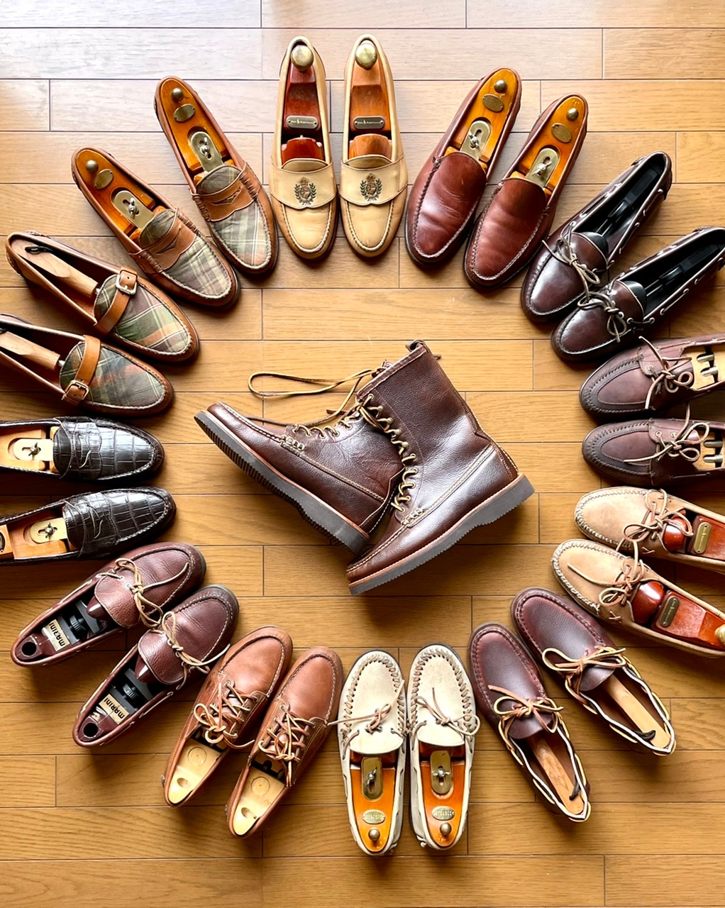 目下手元に残るアメリカ製のモカシン靴。中央のユケテンブーツのみラッセルモカシン別注らしいがそれ以外は全てメイン州にあるファクトリー製。どれもイギリスやフランス、イタリーの靴にはない個性がある。気が付けば13足もの大所帯になってしまったが、どこかでお気に入りの1足を見つけたらきっとまたまた買ってしまうんだろう。