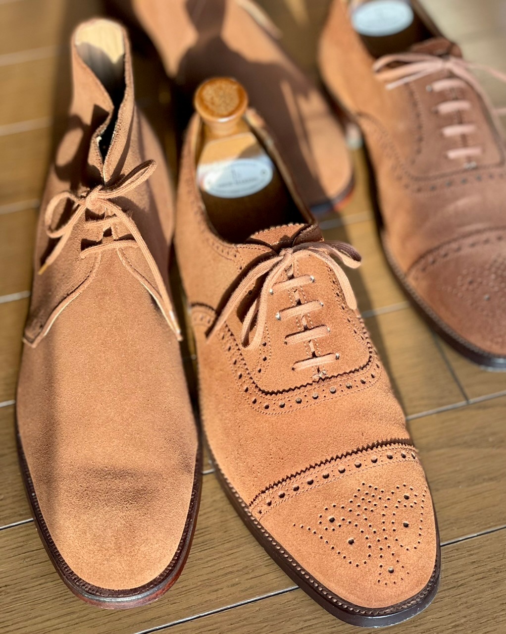 ハケットの提唱する秋冬カジュアルは決してデニムは履かない。カントリージェントルマンらしくツィードジャケットにモールスキンかコーデュロイの細身パンツがお約束だった。足元はスエード、それもタバコスエードの靴がスタンダード。元々ハケットの前身が靴屋のロイドジェニングス、自社ネームの靴をクロケットに作らせたのも当然だったと思う。