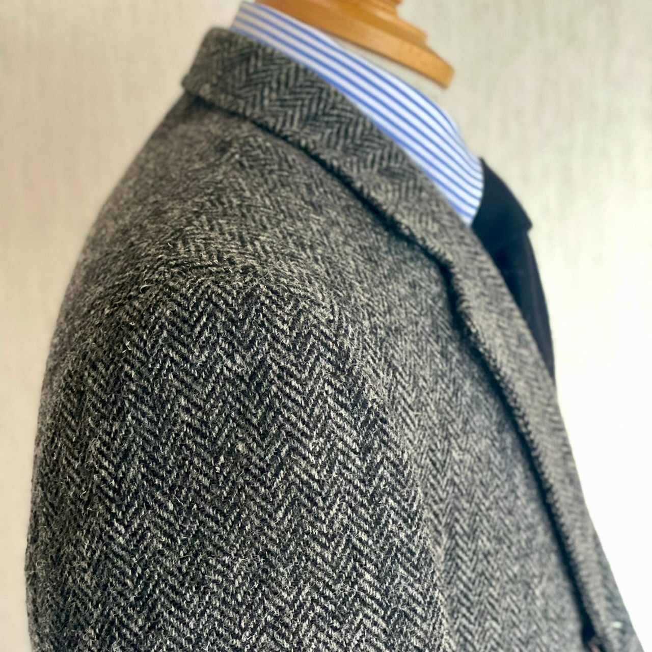 オーダー品らしく身頃にダーツを取りウェストを絞った英国スタイルだが肩はブルックスブラザーズのアイコン、ナチュラルショルダーに仕上げている。オーダー品らしくハンドを多用しているようで肩先を摘むと薄いパッドや袖山を綺麗に見せるたれ綿が僅かに入っているようだ。それでもロープドショルダーのサビルロウジャケットとは触った感触も着心地も重さも違う。