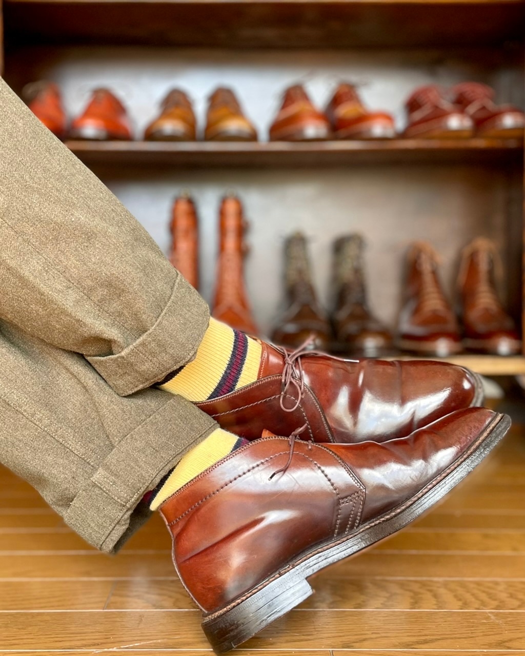 手持ちのオールデンでは2番目に古いチャッカブーツ。海外駐在時にオールデンオブカーメルから取り寄せたものだ。当時はいつもの英国サイズから換算して頼んだら結構大きくてびっくり…もっとも秋冬専用の靴なので厚手のウールソックスを履けば結構上手く収まる。帰国してからもう一足頼んだら日本へはの発送はできないと言われてがっくりしたことを思い出す…。