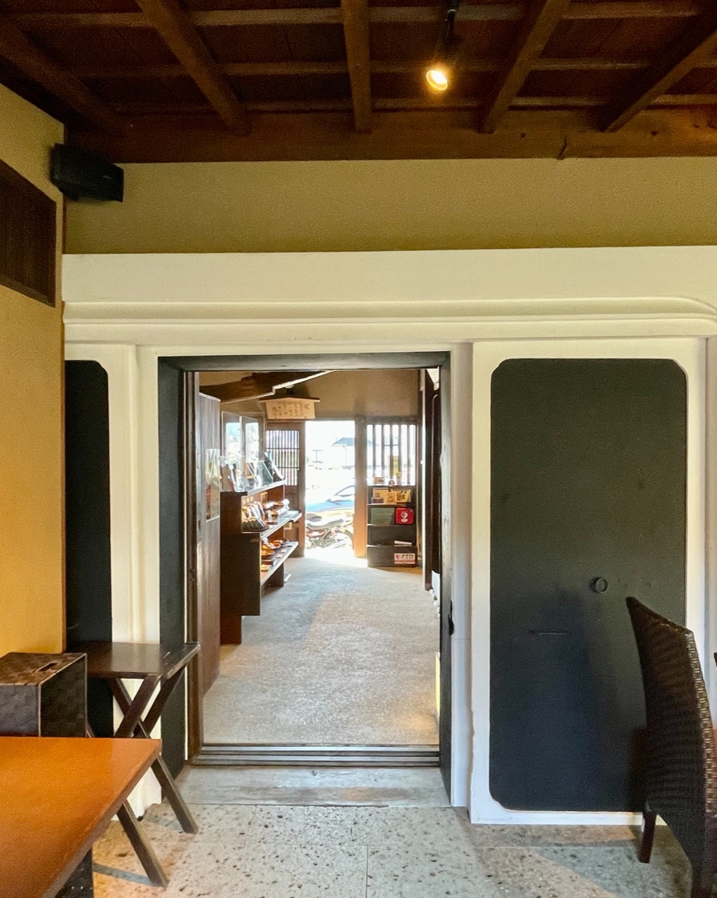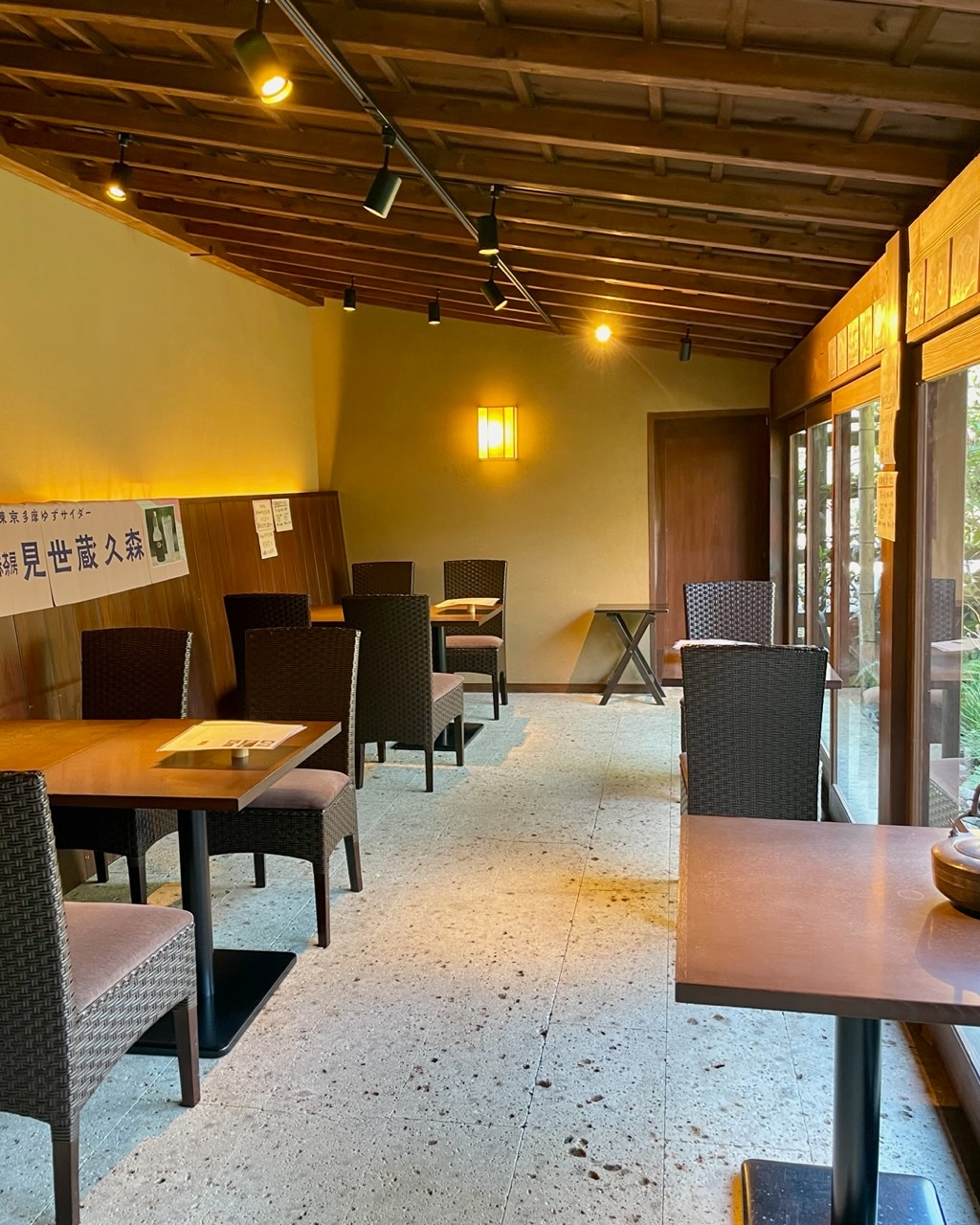 店の奥にある席。本来の蔵に「建て増ししたスペース」とのことだが、元の蔵と違和感のない作りになっている。席と席との間はゆとりも十分、ゆったり寛げるよう配置されている。右側のサッシ外側は小庭とテラス席も用意されていて夏の名物かき氷を冷房の効いた室内で食べるのが苦手な人には格好のスペースだ。