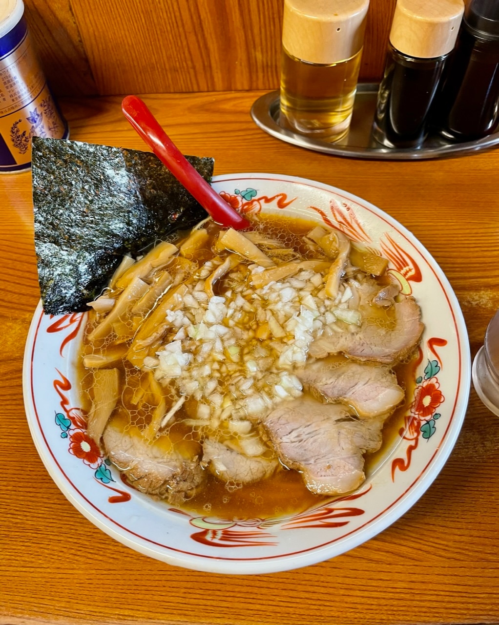 写真はチャーシュー麺。スープは御覧のとおり一見あっさりした醬油味ながら表面に浮かぶ油(ラード)と玉ねぎ(甘い)を絡めて麺を口にすると見た目以上にパンチがある。チャーシューもメンマも美味しいがトッピングの玉ねぎを多めで注文すると全ての具が見えなくなるほど乗ってくるのに驚く。次はぜひ試してみたい。