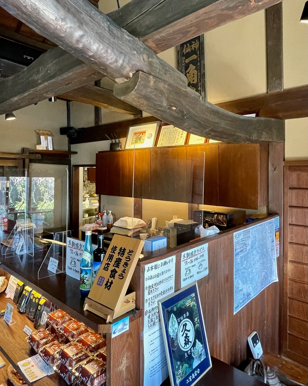 店の中に入るとまず目を引くのが太い梁(はり)。歴史を感じさせる作りだ。何しろ嘉永5年といえばアメリカのペリー提督が4隻の黒船を率いて浦賀沖に到着する前年にあたる。徳川家でいえば12代将軍家慶の頃。明治元年が1868年だから幕末の動乱を生き抜いた建物として歴史好きでなくともロマンを感じる。