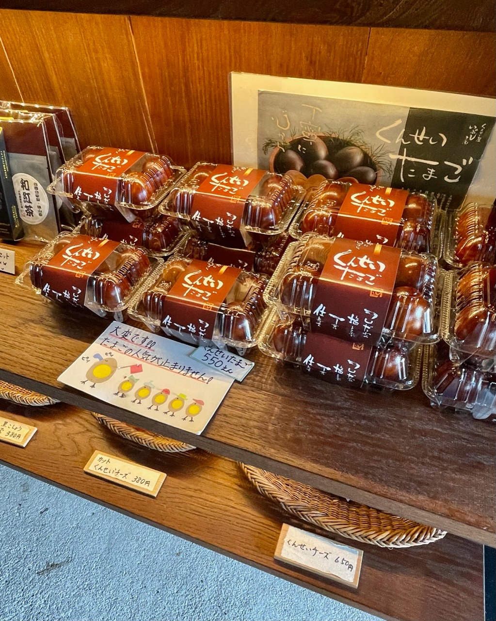店の裏手はかつて「森田酒造」があったという。車で4分の至近にあり親戚関係でもある清酒「多摩自慢」の石川酒造に依頼して昨年4月に往年の銘酒「八重菊」を復刻したそうだ。甘味処なのに何故かメニューに「純米酒八重菊グラス」と書かれていたのもそんな経緯があったからなのか…と納得。レジ前の人気土産くんせいたまごといい意外な発見が楽しい。(8) 店内(その3)