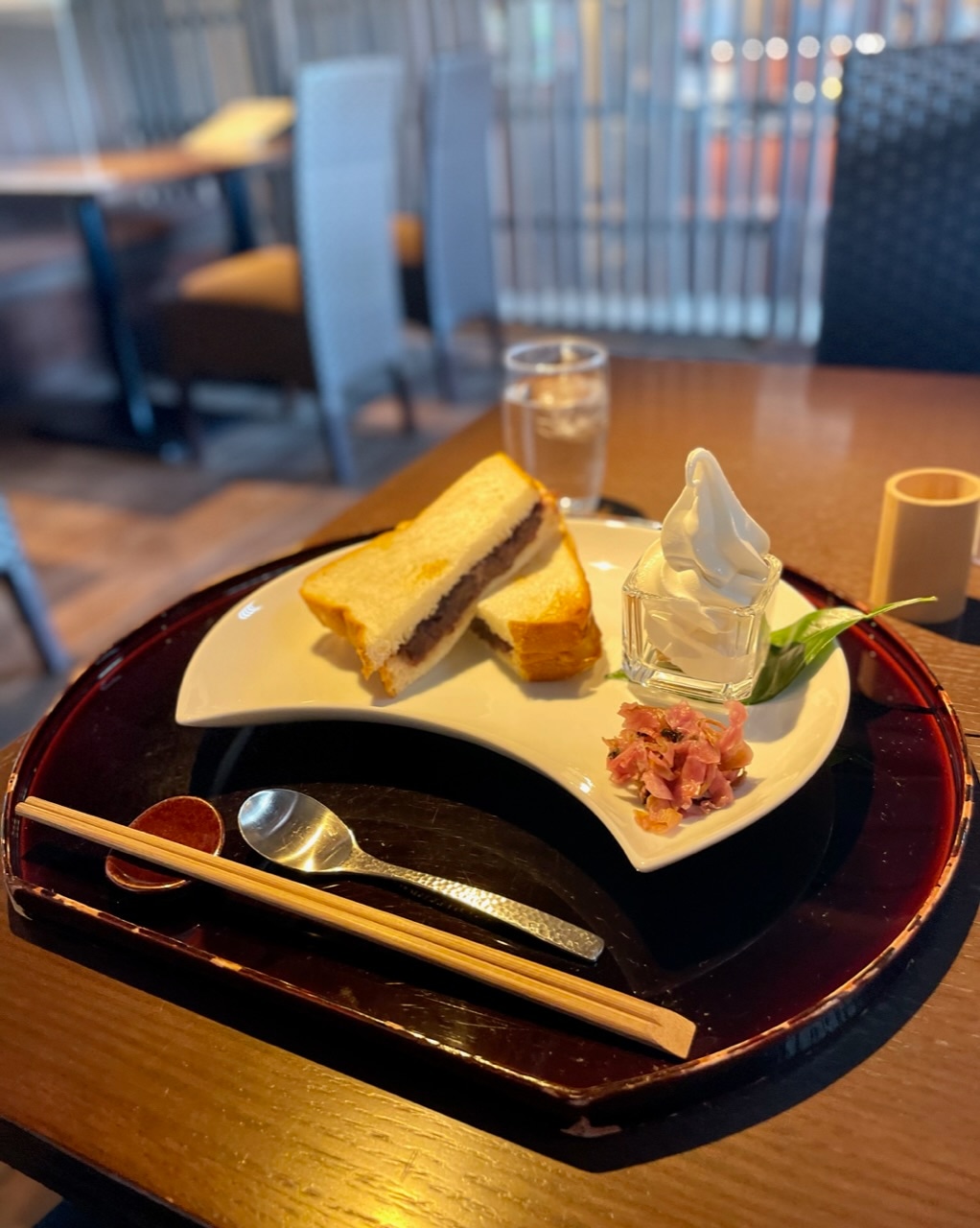 運ばれてきたあんこトーストセット。トーストの間の小倉あんがまるでカツサンドのようだ。手前のスプーンはミニソフトクリーム用、箸は漬け物用か。因みにソフトクリームは東京牛乳を使った自家製、ウェブサイトトップに「スローライフ、スローフード」を掲げる「久森」では地産地消の素材を使い丁寧に仕上げた食べ物で客の心を和ませる。