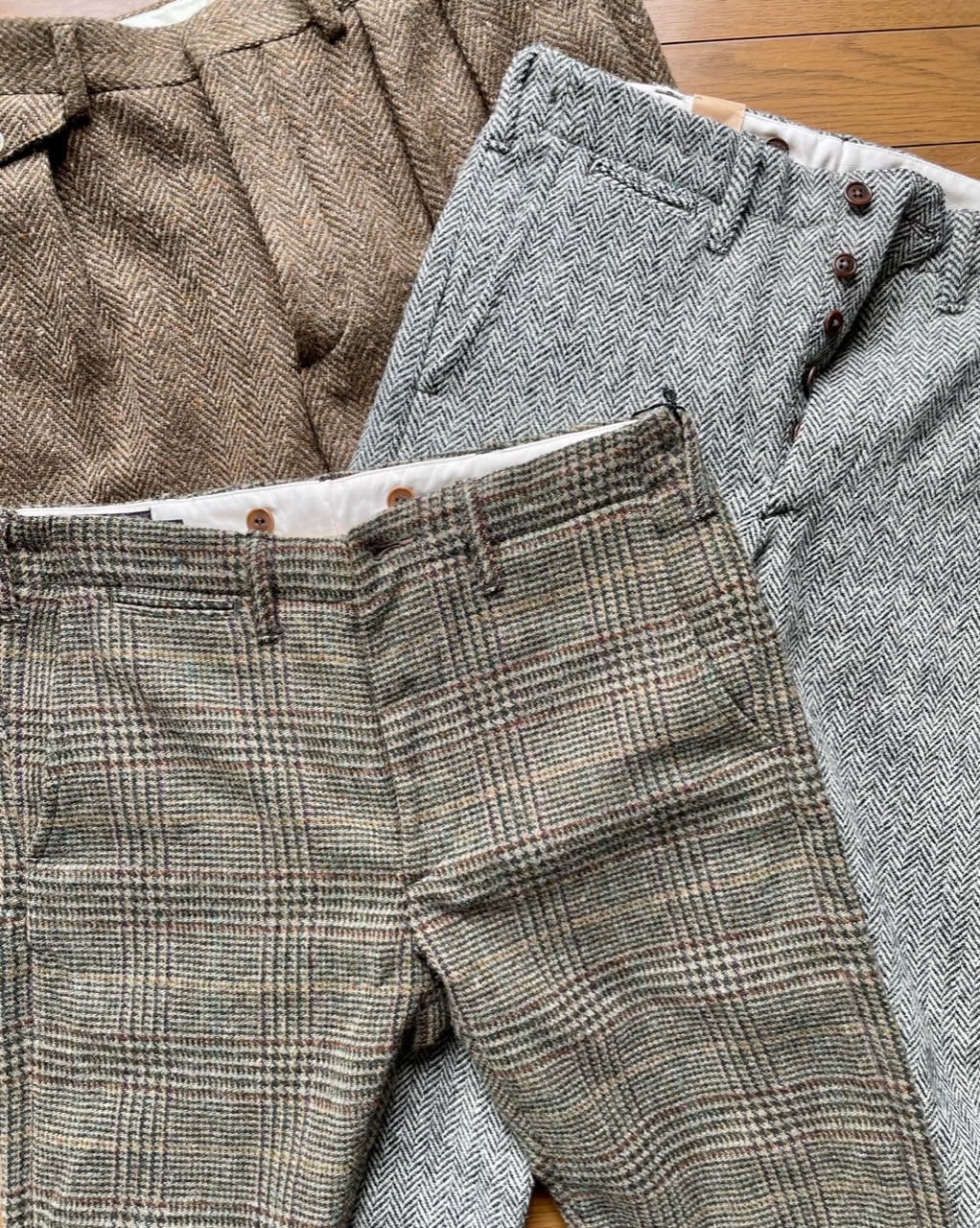 ようやく見つけた定番ヘリンボーンのツイードパンツ…ハリスツイード特有のゴワゴワ感やチクチク感は敬遠されがちなのか手に取って見る人も少ない。何しろこのパンツ、裏地が膝下まで覆っている。肌触りを考慮してだろうが脱ぐ時は慌ててはいけない。一気に脱ぐと踵に裏地が引っ掛かって破いてしまうからだ…。