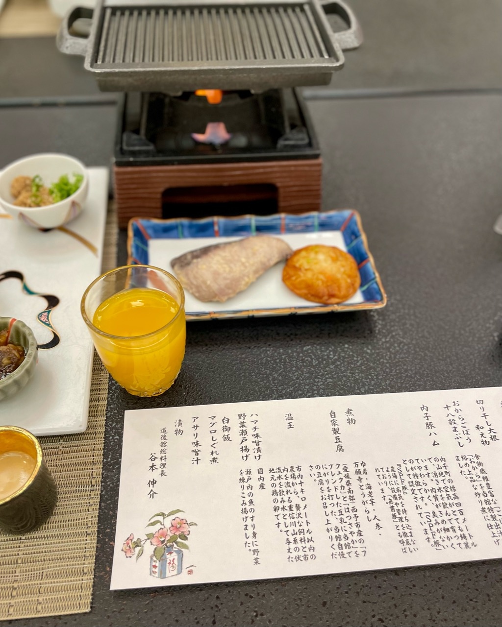 火のついた鉄板は名物の瀬戸揚げを軽く炙るためのもの、愛媛らしく伊予柑の搾りたても用意されている。お品書きの説明を丁寧に読みながら一品一品味わうとゆったり時が過ぎていく。旅行の醍醐味は非日常を体験できること…朝食に1時間もかけるなんて滅多にできるものじゃない。