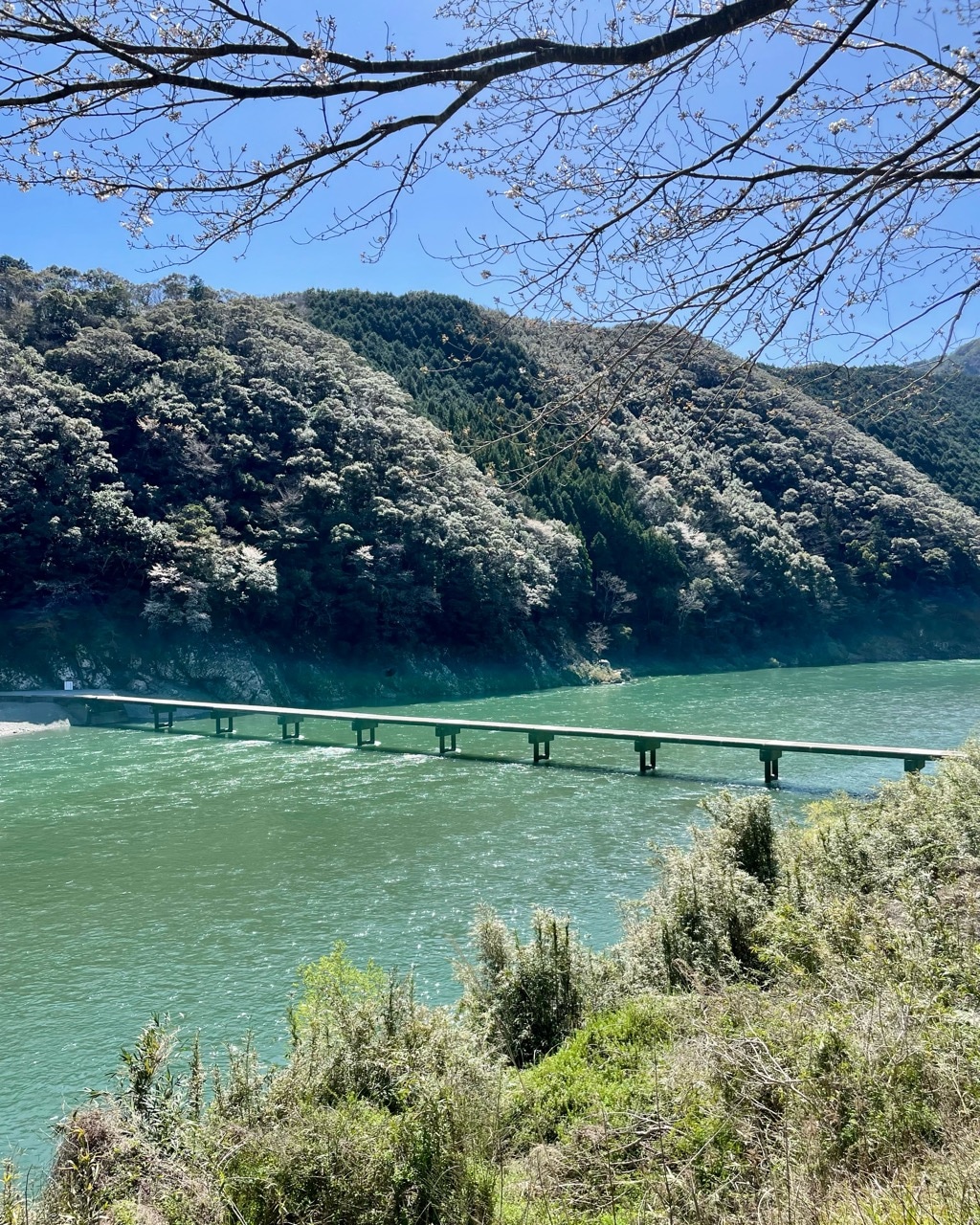 老朽化で通行止だったこの橋も2021年4月29日(GW初日)に3年5か月ぶりで開通したとのこと。当時の「コロナ禍が落ち着いたら観光客にも四万十の景色を見に来てもらいたい」というメッセージにこの橋への地元愛を強く感じる。帰り際に一台の車が橋を渡る様子を撮影。何気ないが絵になる。