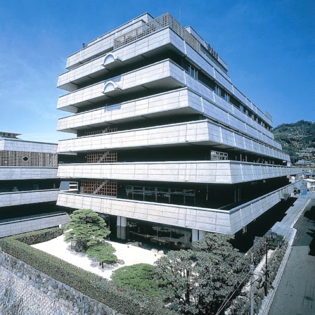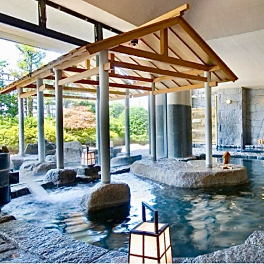 軍艦のようなと称されるコンクリート打ちっぱなしの外観は建築界の大御所、黒川紀章が設計を手がけたという。広々としたロビーはもちろん温泉宿だけに大浴場や露天風呂も風情のある作りになっている。マッサージ付きのチェアが室内に完備されている。風呂上がりに使えば旅の疲れも一気に取れそうだ。