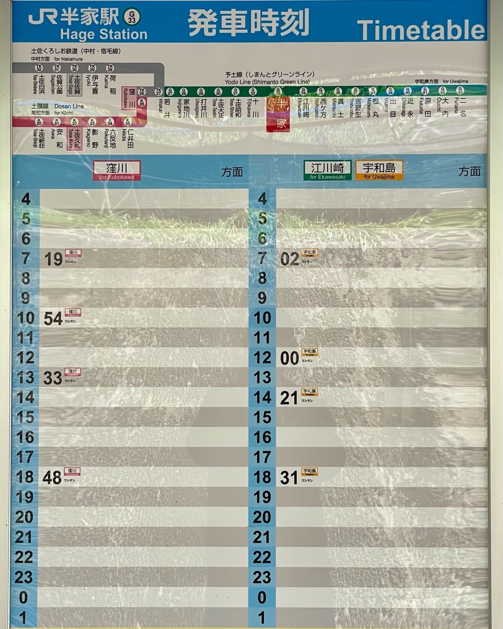 因みに半家駅の時刻表を見ると停まる列車は一日に上下4本ずつ。せっかくなので13時33分の窪川行を待つことにした。伊予と土佐を結ぶ本来の「予土線」の他に「しまんとグリーンライン」の愛称がある。四万十川に沿って走る予土線だけに車窓はそざかし眺めが良いに違いない。