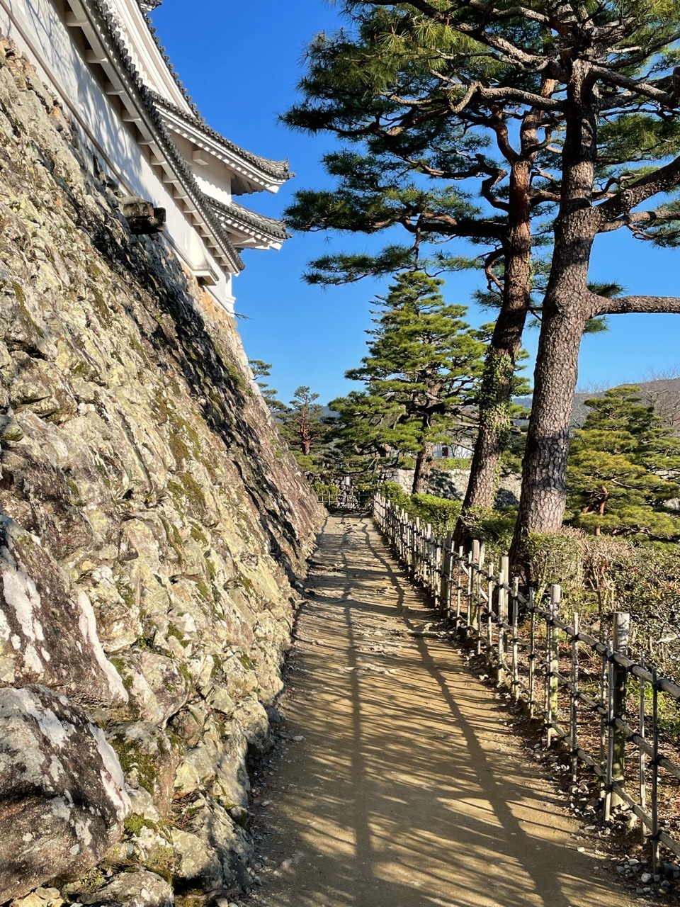 鉄門跡から天守を見上げた様子。よくもこれだけの石を積み上げたものだ。しかも僅か11年で完成させたというのだから当時の人々のパワーに圧倒される。左端に散歩を楽しむ人が写っている。もう1人方トレーニング中の人とも出会ったがどちらも先に「おはようございます」と挨拶を交わしてくれた。おかげで朝から気分が良い。