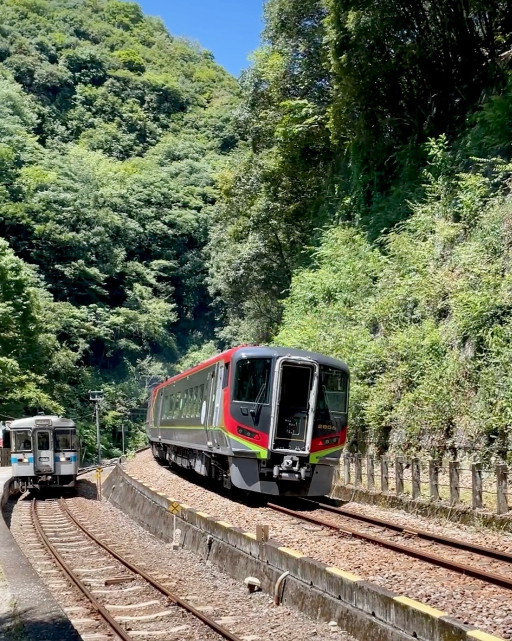 到着した坪尻駅。左が乗ってきた列車。ワンマン列車なので運転手に切符を渡して下車…他に誰もいないと思ったがなんと4人も降りた。一日の平均乗降客数が2人(令和3年度)の駅だからこの日は既に上回っている。ここ何年も秘境駅が密かにブームだとか。通過待ちの普通列車を特急「南風」が追い抜いていった。
