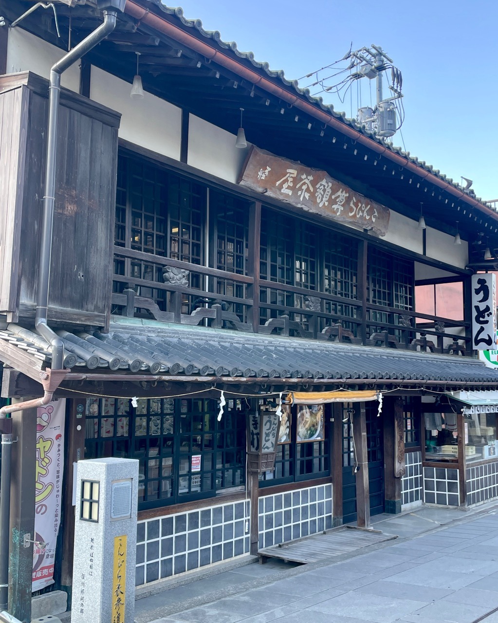参道を下ると両脇の店はどこも店じまいの準備をしている。こちらは写真映えのする「こんぴら算額茶屋」。行きは営業していたのに戻って来たら既に閉まっていた。元は櫻屋という名の門前宿だったらしく二階の高欄に彫刻を施すなど凝った作りが見どころだ。国の有形登録文化財とのこと。茶屋とあるがお薦めはこんぴらうどんらしい。
