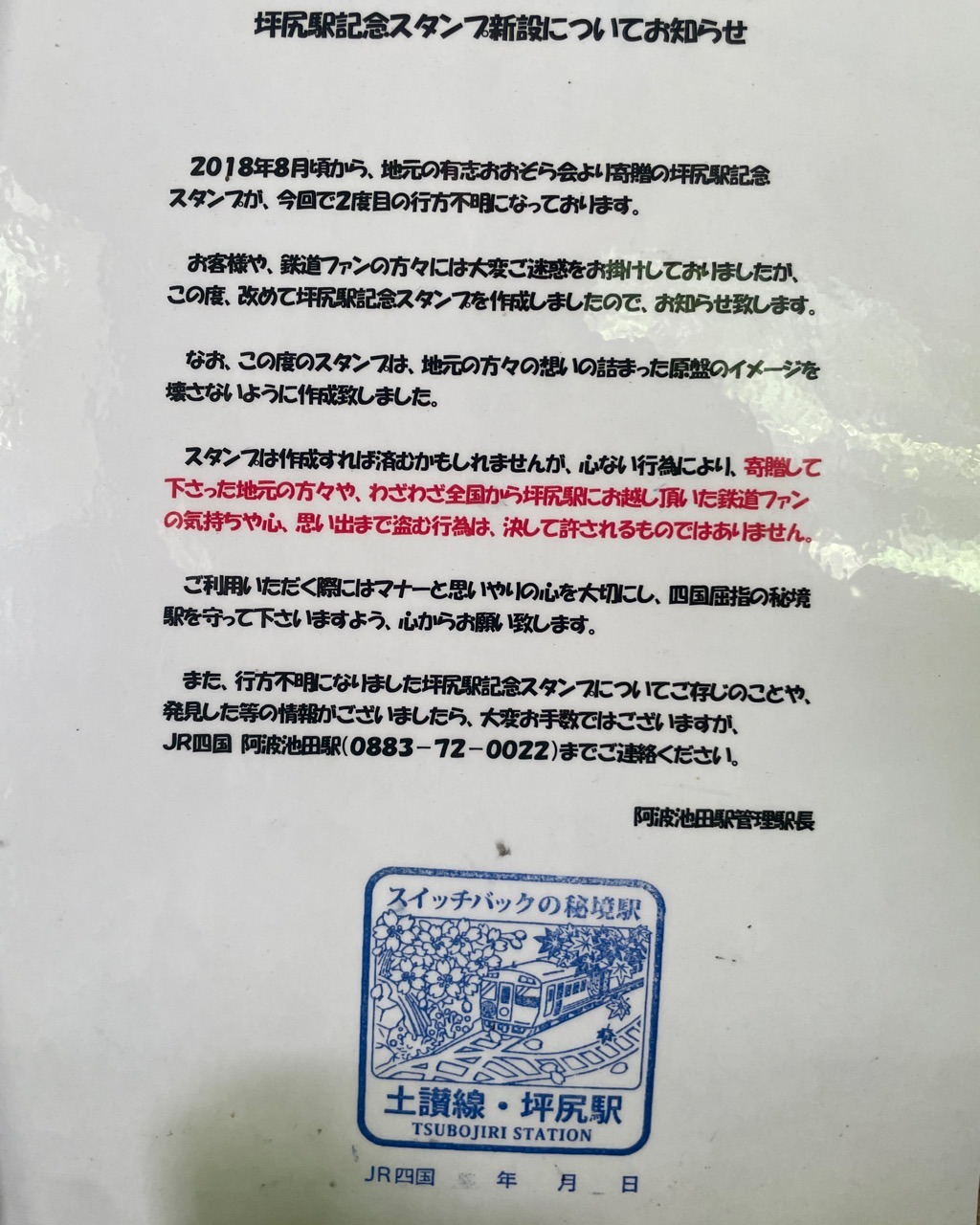 スタンプ台の上には2枚のお知らせが…ひとつは平成20年に地元から寄贈された初代駅スタンプが平成22年に盗まれ二ヵ月後に青森県の津軽線中沢駅で発見されたというもの。もうひとつが平成30年に再び盗まれ今度は行方が分からずここで二代目のスタンプを設置したというもの。マニアによる窃盗だったらと思うとやるせない。