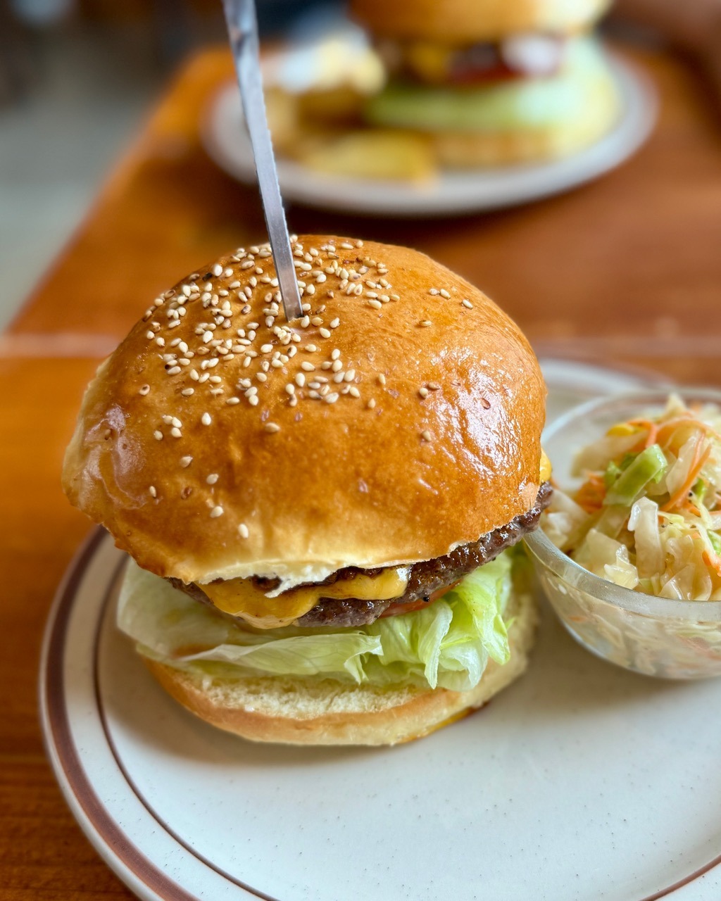 こちらはチリチーズバーガー、スパイシーなチリビーンズがアクセントになっている。付け合わせはコールスローに変更、ビールは北海道でしか飲めない「サッポロクラシック」を注文した。バンズが美味しいな…と思ったら毎朝店で焼き上げる自家製だそうだ。パティも肉汁の溢れるつなぎなしの100%牛肉。