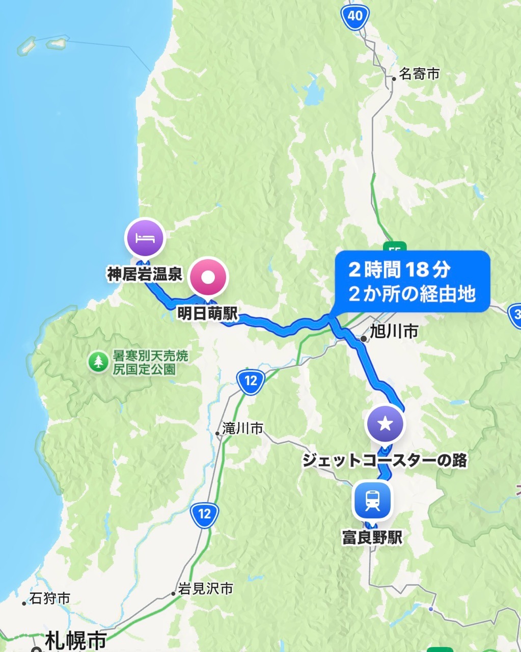 神居岩を出発する前にルートを確認。途中「明日萌駅」に立ち寄りジェットコースターの路を通って富良野まで2時間強のルートだ。実際は給油が加わるのでもう少し複雑になる。ガソリンタンクの大きなバイクなら給油なしで一日中走れようがフォーティエイトはタンクが小さい分小まめなGS立ち寄りが必須だ。