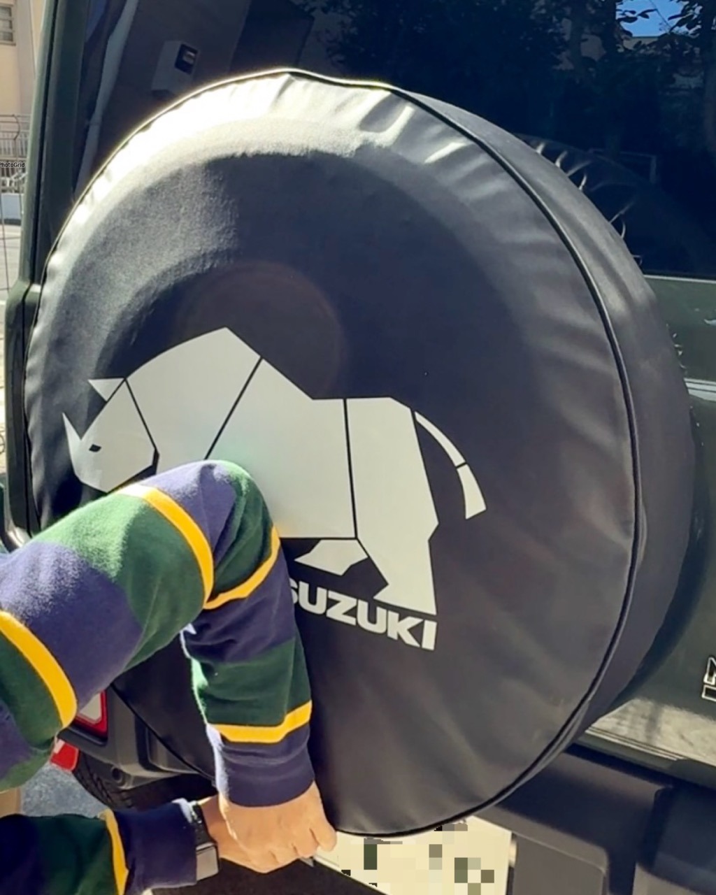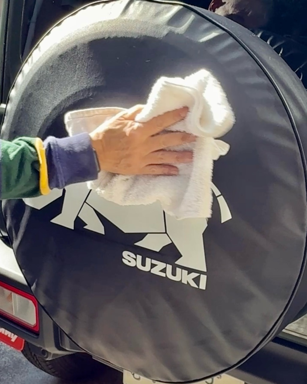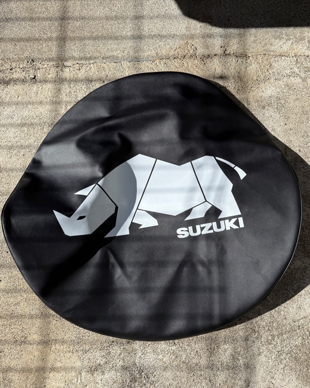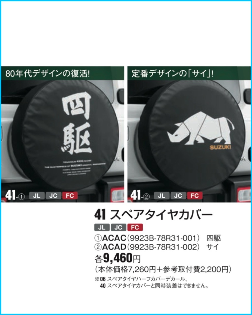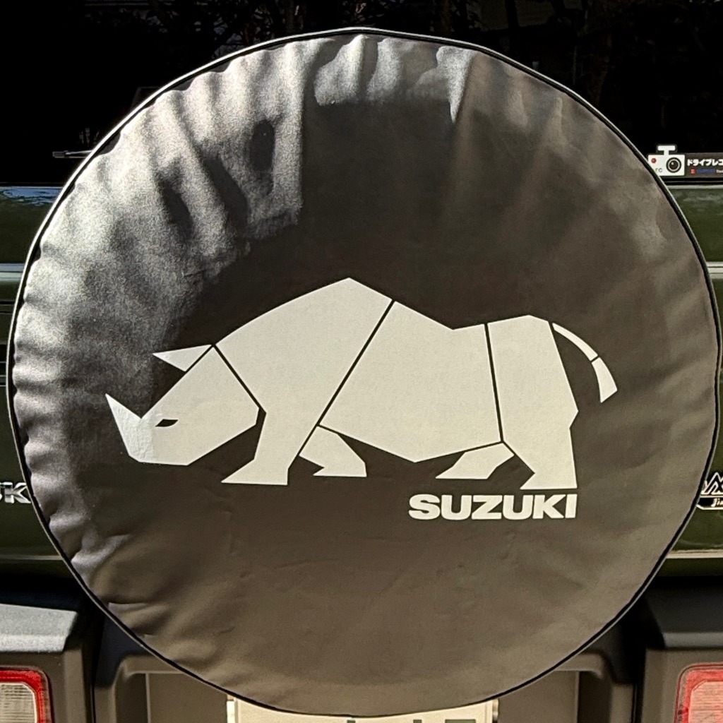 これから夏を迎えタイヤに直射日光が当たると劣化が進みがちなスペアタイヤ。どうもカバーは必須のようだ。スズキ純正カタログを見るとタイヤカバーは2種類。定番のサイをチョイスしたがここで品番が変更になっていてスズキの文字が金から白に替わっていた。