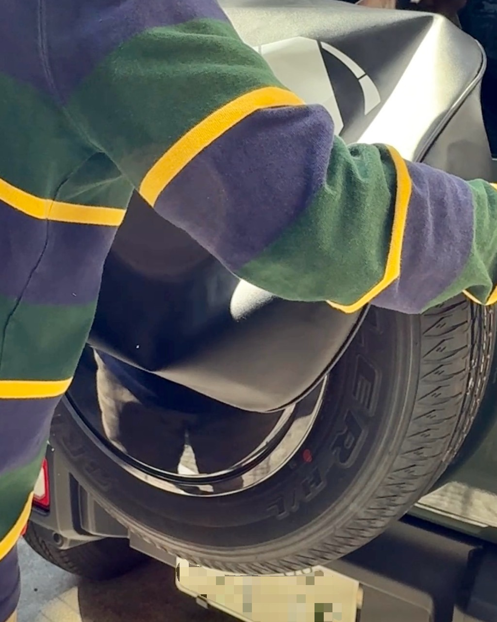 水平位置が決まったら下まで被せていく。どうしても先に被せた上部が深く入っているのでタイヤの外縁とカバーの円周部分=玉縁線が重なるよう修正していく。上下左右、斜めとカバーを緩めては反対側を引っ張って丁度いい塩梅にするのが綺麗に見えるコツだ。