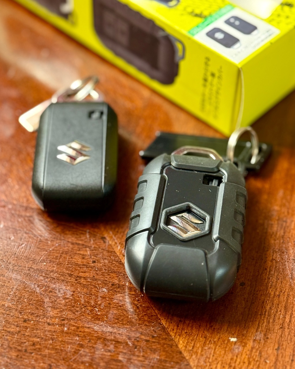右がカバーを装着したスマートキー。モナカのように2つに分かれたパーツにスマートキーを入れてパチッと蓋をするだけの簡単な構造だ。勿論機能はそのまま使える。後はGS用スマートキーホルダーを定期的に付け替えれば乗車の際キーを間違えることもなかろう。