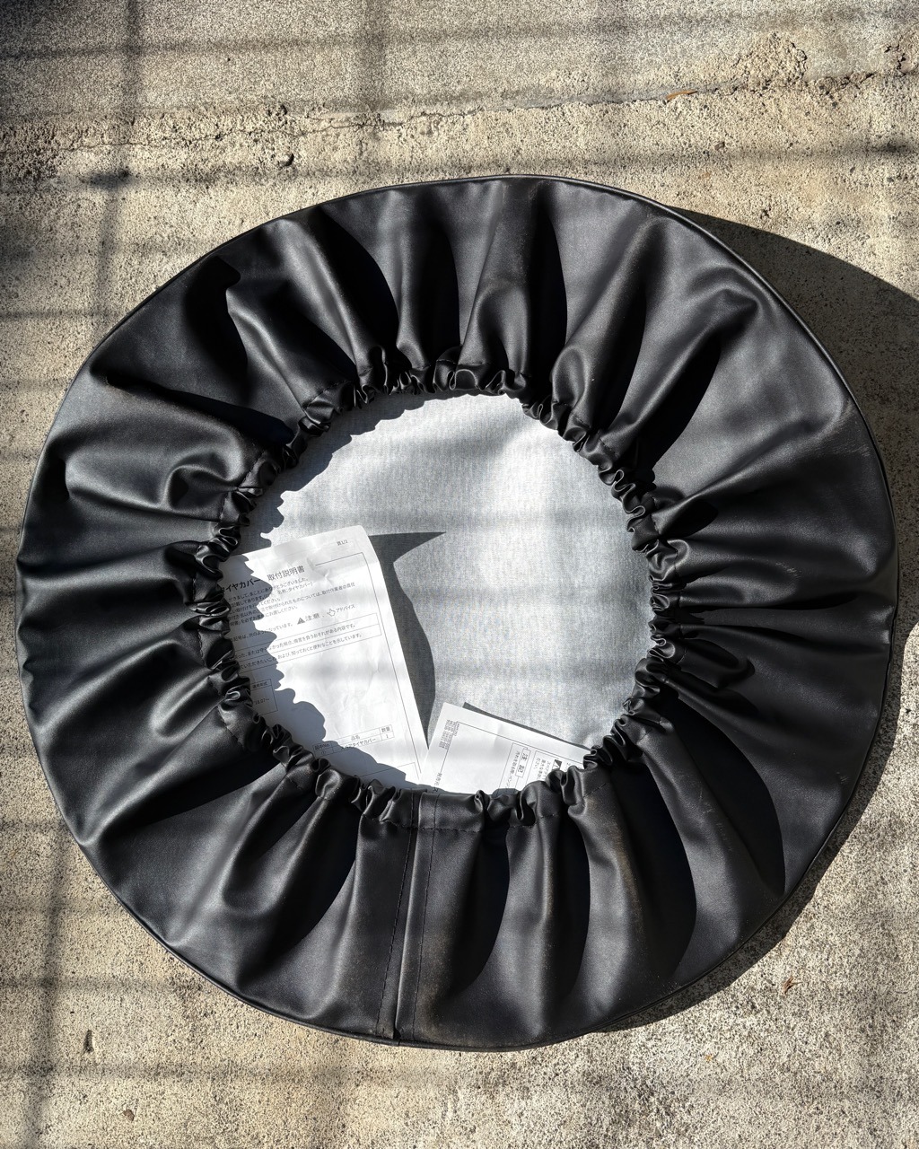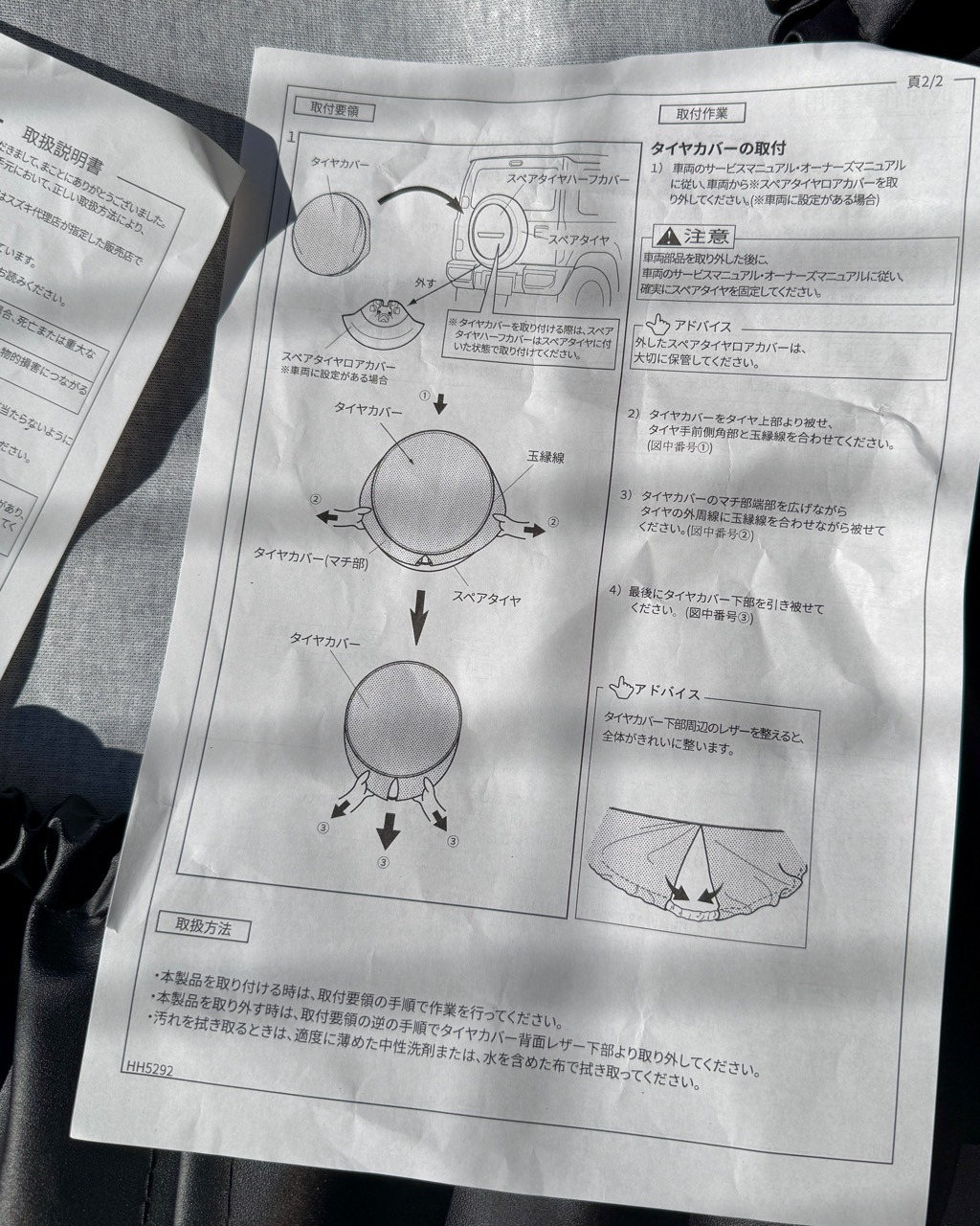 ギャザーの入った裏面。一応取扱説明書も入っている。この辺りは昔乗っていたパジェロの頃から全く変わっていない。とはいえ分かったつもりで説明書を良く読まずに作業を始めると間違っているなんてこともある。急がば回れ…まずは説明書を読んでみる。