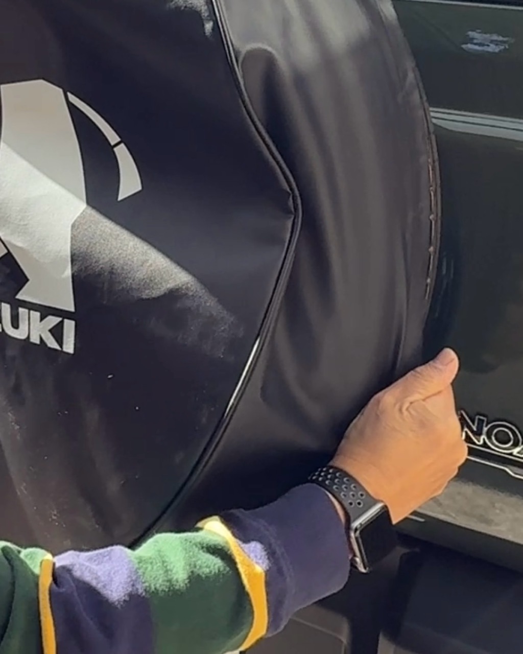 我が家のノマドは「スペアタイヤロアカバー」が装着されていないのでスペアタイヤハーフカバーは付けたまま上から被せていくだけの簡単な作業のようだ。因みにメーカー純正でないカバーにはサイではなくカバだったり素材もハードシェルタイプのものなど選び放題だ。