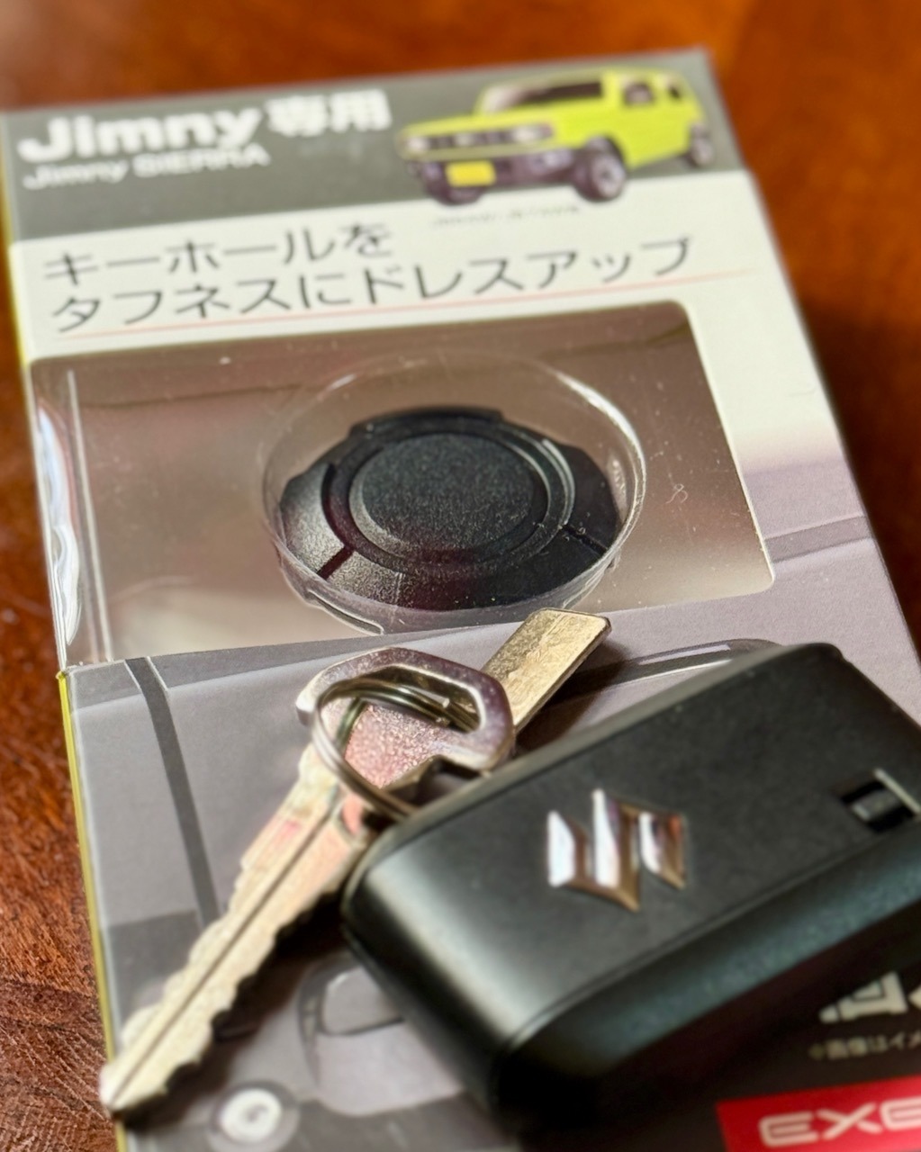 地元のイエローハットでもジムニーのアクセサリーパーツが豊富なのに気付いて買ったのが上の2点。一つはキーカバーでもう一つがキーホールカバーとどちらも車の鍵に関係するアイテム。ジムニーの人気色であるキネティックイエローのパッケージは店内でも目立つ。