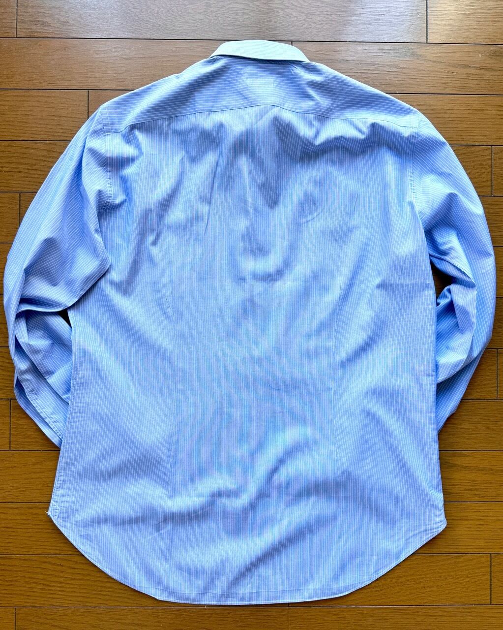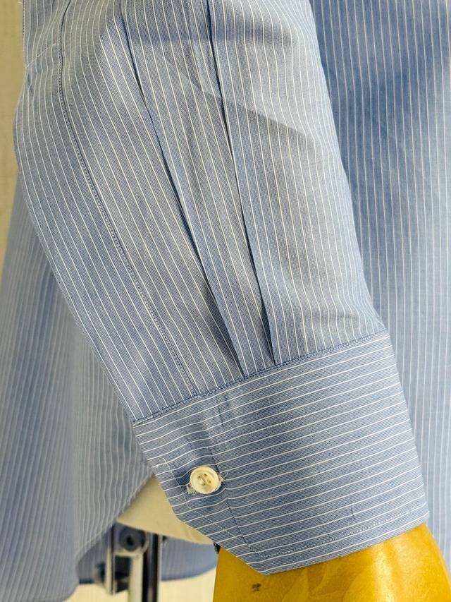 ローマの仕立てシャツ屋ミコッチで誂えたシャツの紹介です。カルロリーバを使用しておりその着心地の良さは至高のシャツとも称されます。青地に白のオルタネートストライプは遠目には無地にみえる控えめな柄、ジャケパンスタイルはもとよりスーツにも最適です。オーダー時にカルロリーバの生地が最後の一着分のため共布の替襟と替カフの代わりに同じカルロリーバのボイル生地を使用した白の替襟と替カフが付いています。そんな洒落た提案をしてくるのもイタリアのカミチェリア(シャツ屋)ならではといえます。