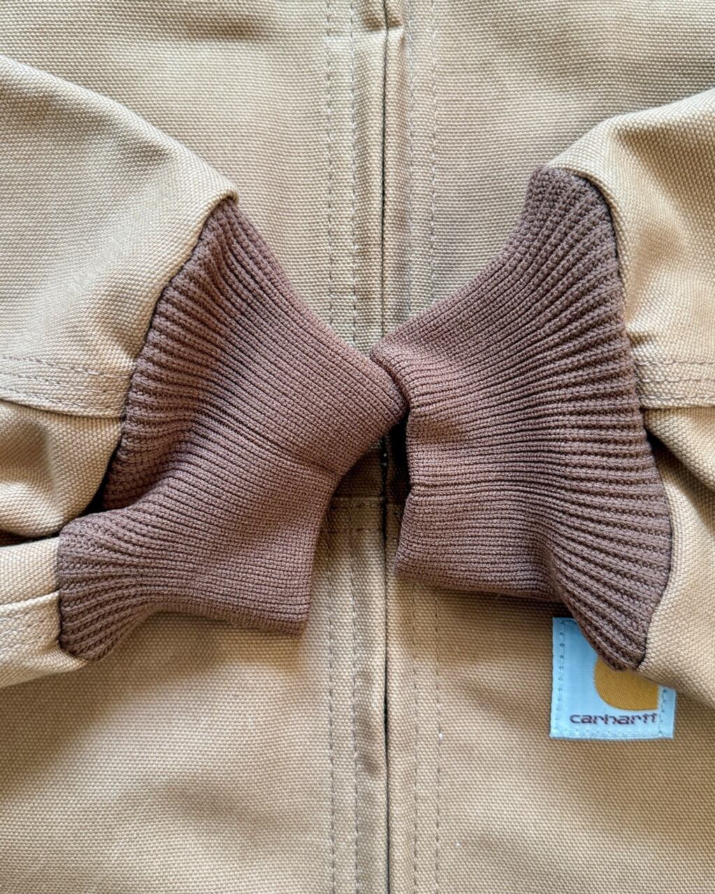 カーハートより12オンスダックを採用したフード一体型のアクティブジャケットの紹介です。頑丈なトリプルステッチで縫製されたシェルにブラス製のジップを採用、袖先と裾の肉厚なニットリブは外気の侵入を防ぎ、ボディーから袖やフードまで張られたサーマル裏地が高い保温性を実現しています。ウエストの大型ハンドポケットとロゴマーク、内ポケットやハンガーループにフードのドローコードなどディティールに抜かりはなく生涯着られるであろう究極のタフウェアです。しかも希少なアメリカ製に加え品質タグにUFCW(全米食品商業労働組合)が印字されており将来古着としての価値も高くなる一着といえます。