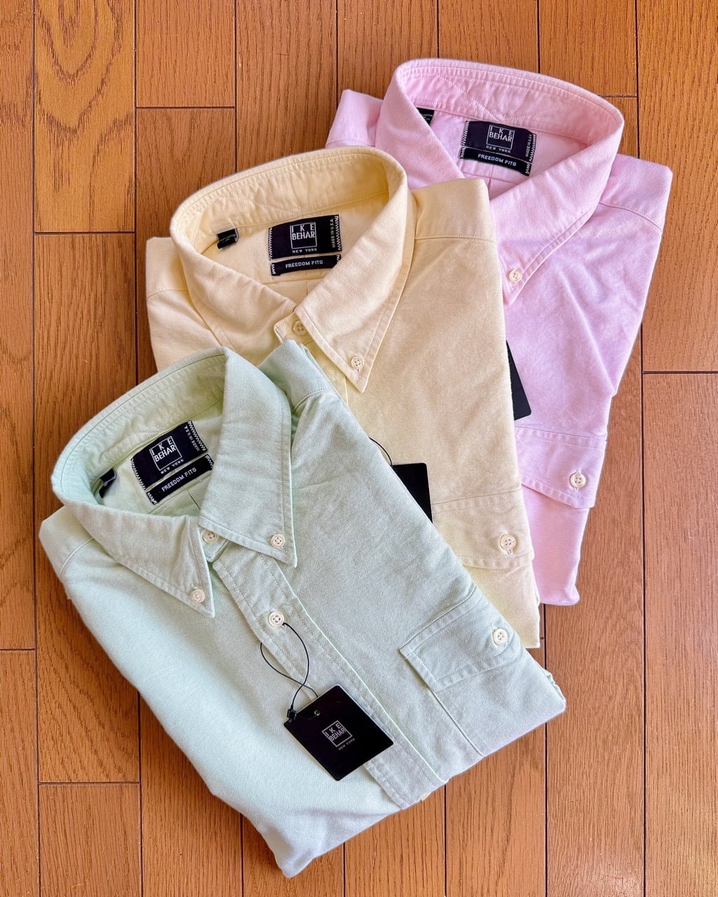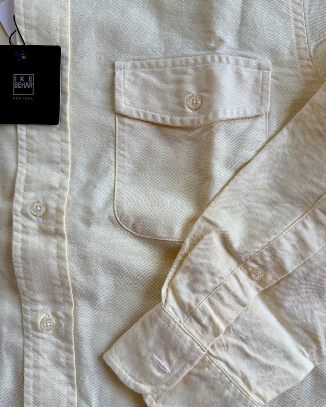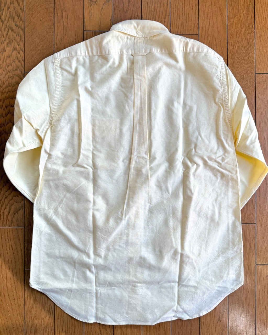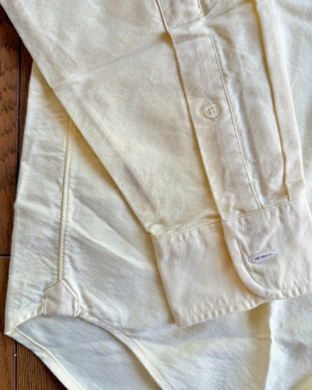 既にアメリカ国内の工場をクローズしたと言われるアイクベーハーの米国自社工場製、デッド品のOCBD(オックスフォードクロスボタンダウン)シャツの紹介です。1980年代にラルフローレンのシャツを請け負っていたのは有名な話ですがその流れを汲むショートポイント気味の襟がアイクベーハーらしさを表しています。襟後ろのボタンやロッカーループにボタンフラップ付のチェストポケットなど日本のアイビーファッションがこだわるディテールが全て盛り込まれています。スプリットヨークやガウントレットボタンに裾両脇のサイドガセットなど本格的な作りのBDシャツはスウェットの下にカジュアルに着ても良し、ブレザーと組み合わせてプレッピーな装いに振っても良しの万能な一枚です。