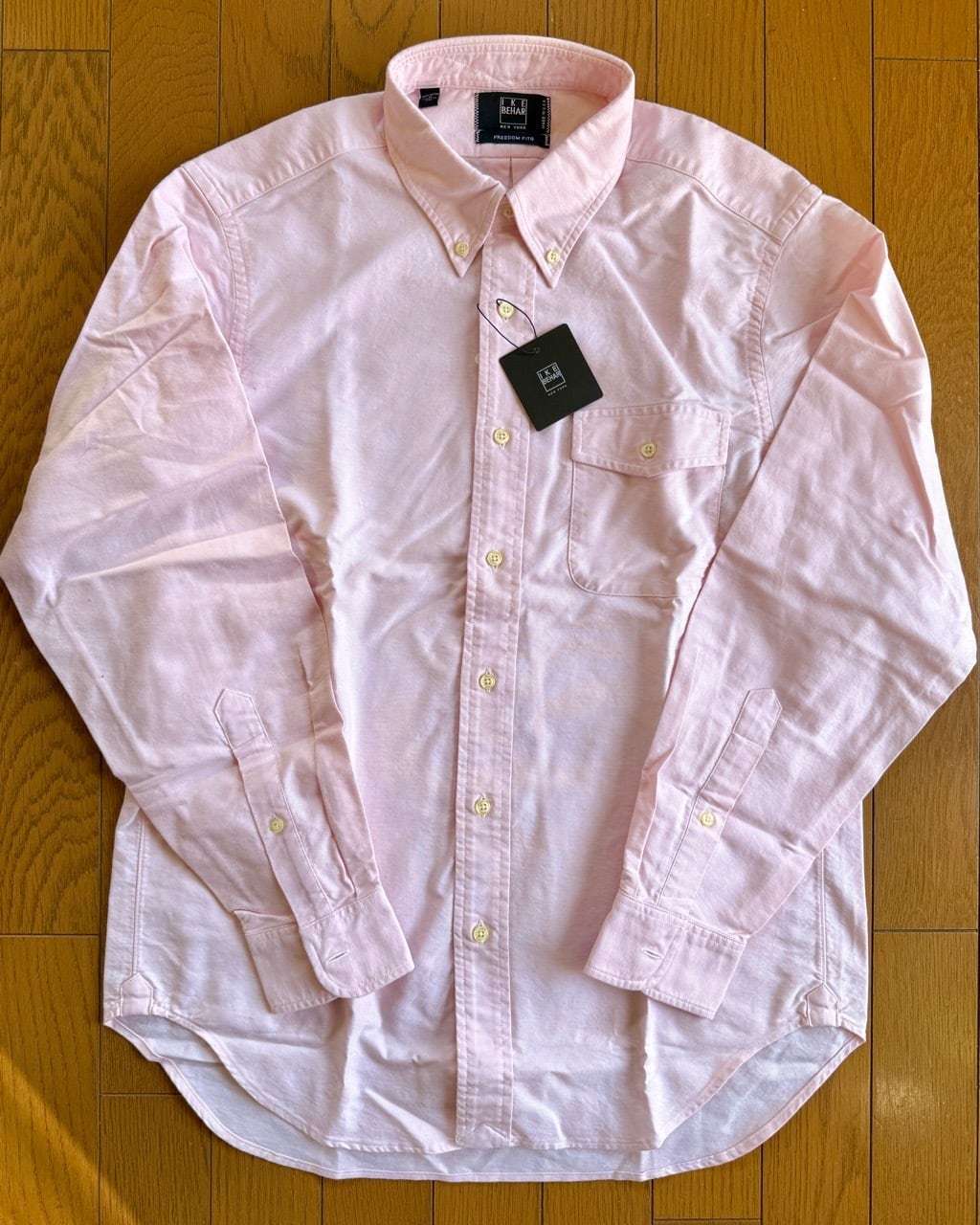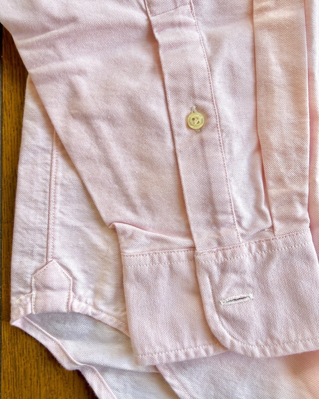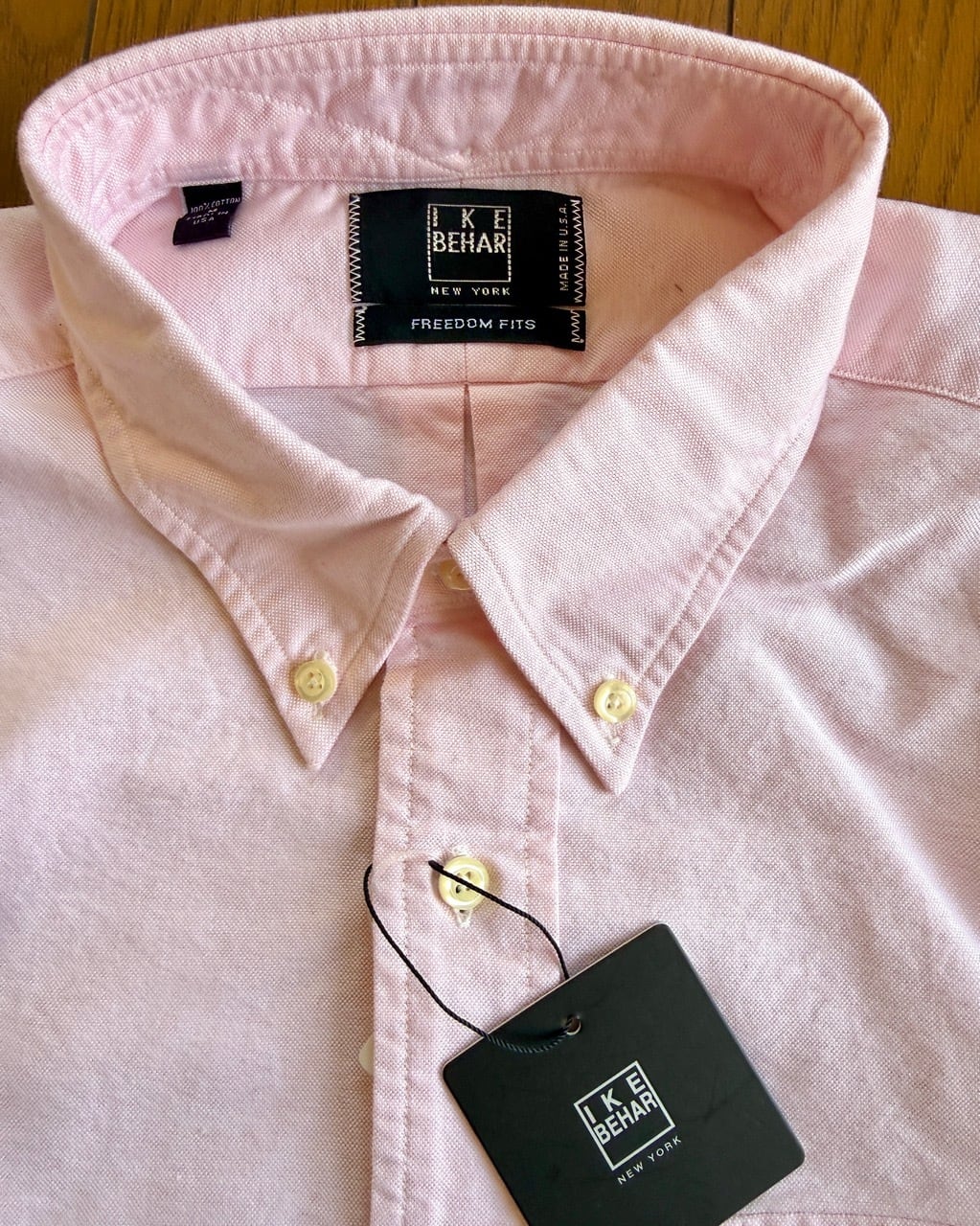 既にアメリカ国内の工場をクローズしたと言われるアイクベーハーの米国自社工場製、デッド品のOCBD(オックスフォードクロスボタンダウン)シャツの紹介です。1980年代にラルフローレンのシャツを請け負っていたのは有名な話ですがその流れを汲むショートポイント気味の襟がアイクベーハーらしさを表しています。襟後ろのボタンやロッカーループにボタンフラップ付のチェストポケットなど日本のアイビーファッションがこだわるディテールが全て盛り込まれています。スプリットヨークやガウントレットボタンに裾両脇のサイドガセットなど本格的な作りのBDシャツはスウェットの下にカジュアルに着ても良し、ブレザーと組み合わせてプレッピーな装いに振っても良しの万能な一枚です。