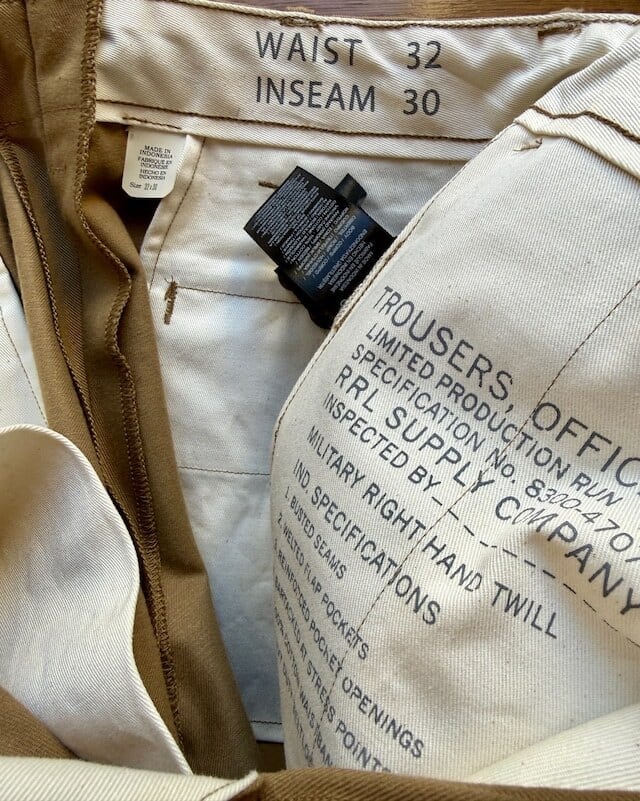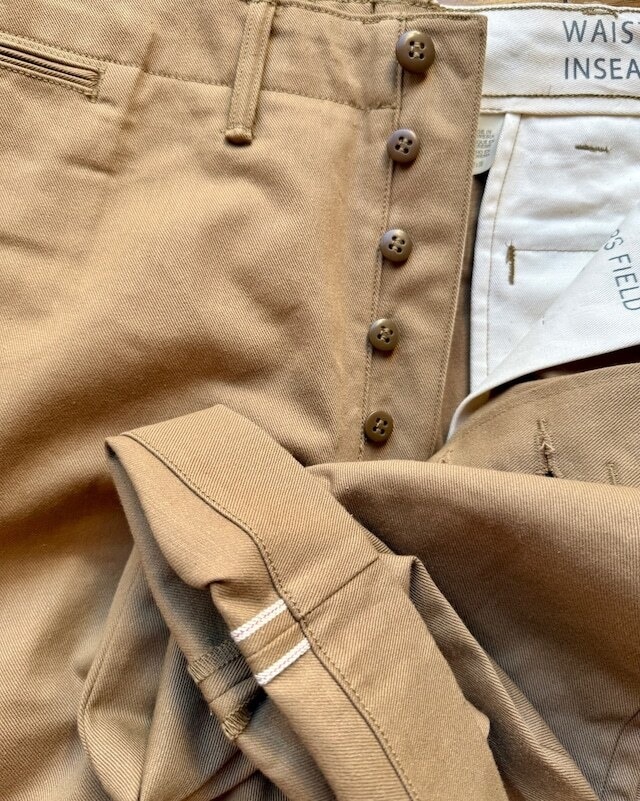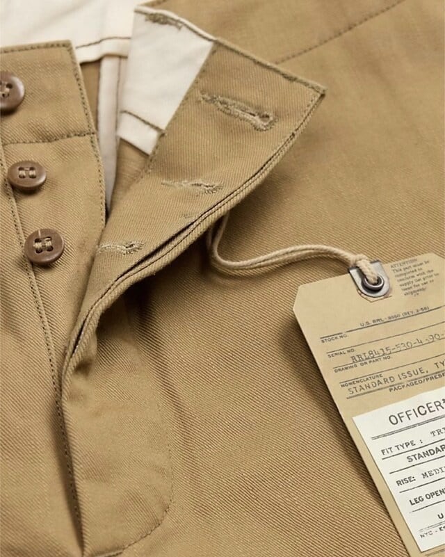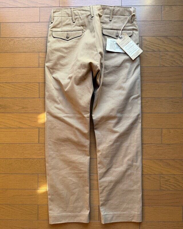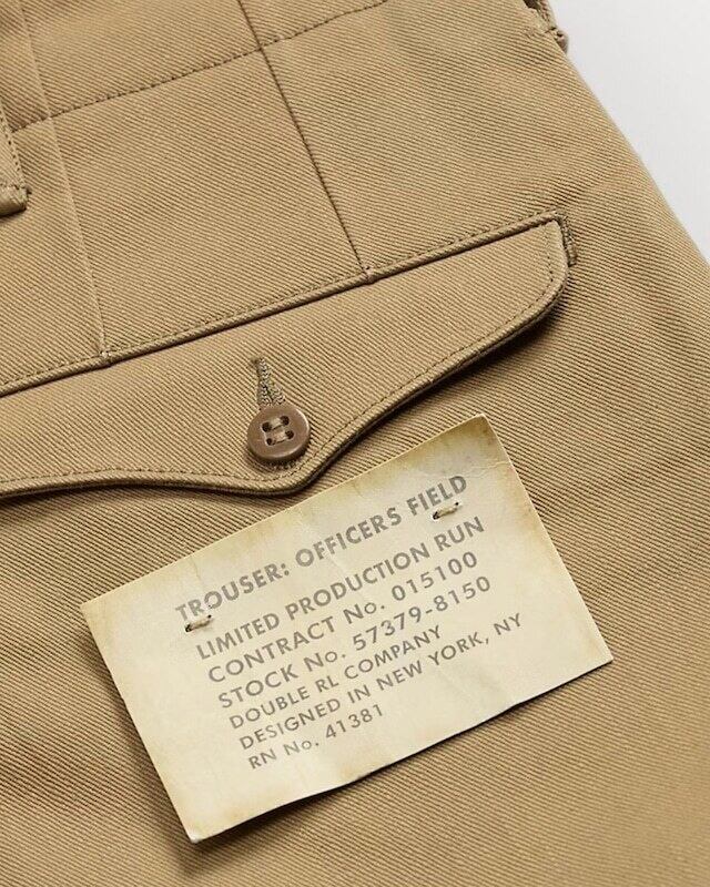 RRLより日本製11.6オンスの左綾織セルビッジツイル地を使用したコットンパンツの紹介です。リラックスフィットのミリタリーチノと違いオフィサーズパンツは股下から裾までストレートなラインが特徴、ボタンフライやコインポケットなど限定生産らしく素材と作りにこだわっています。