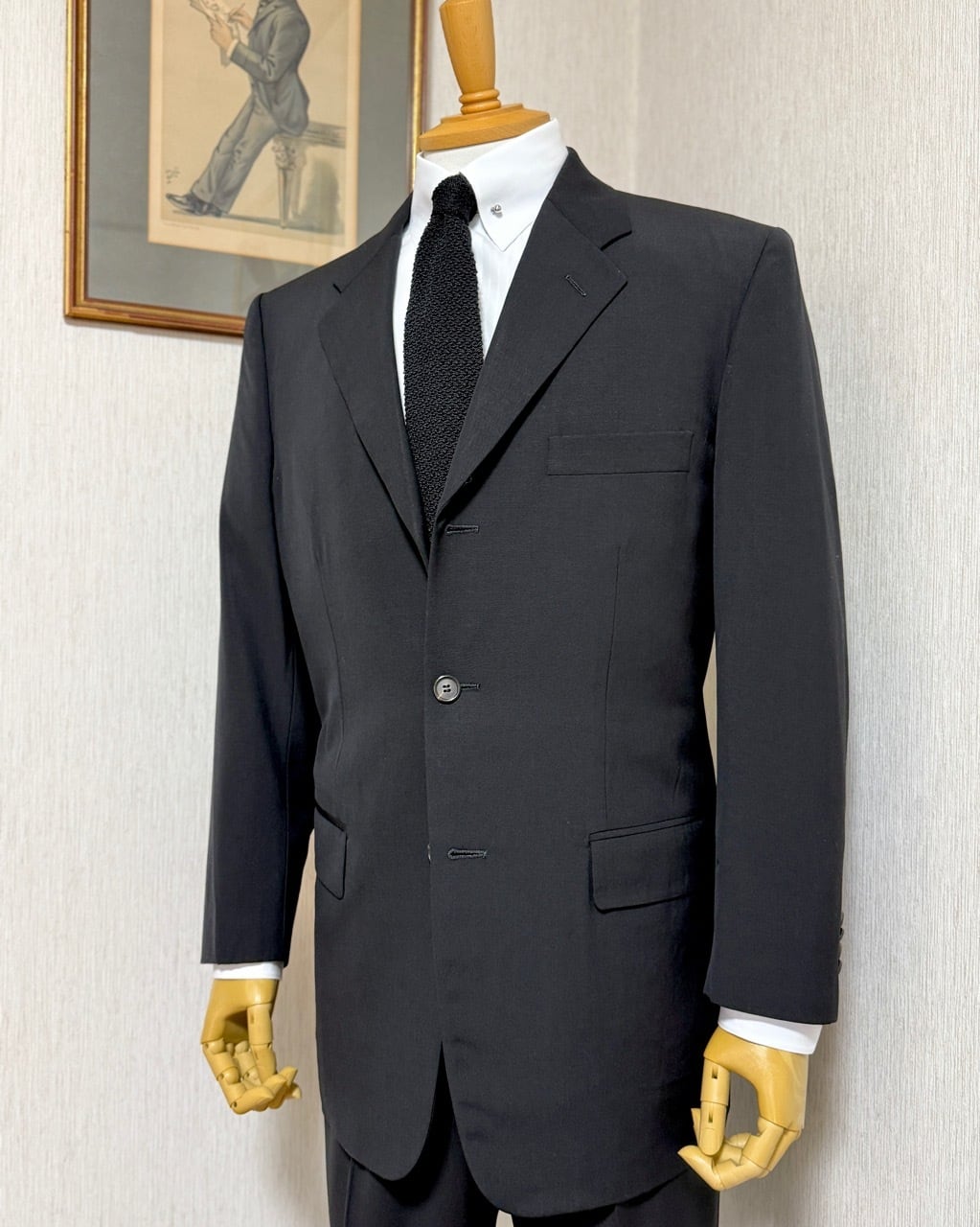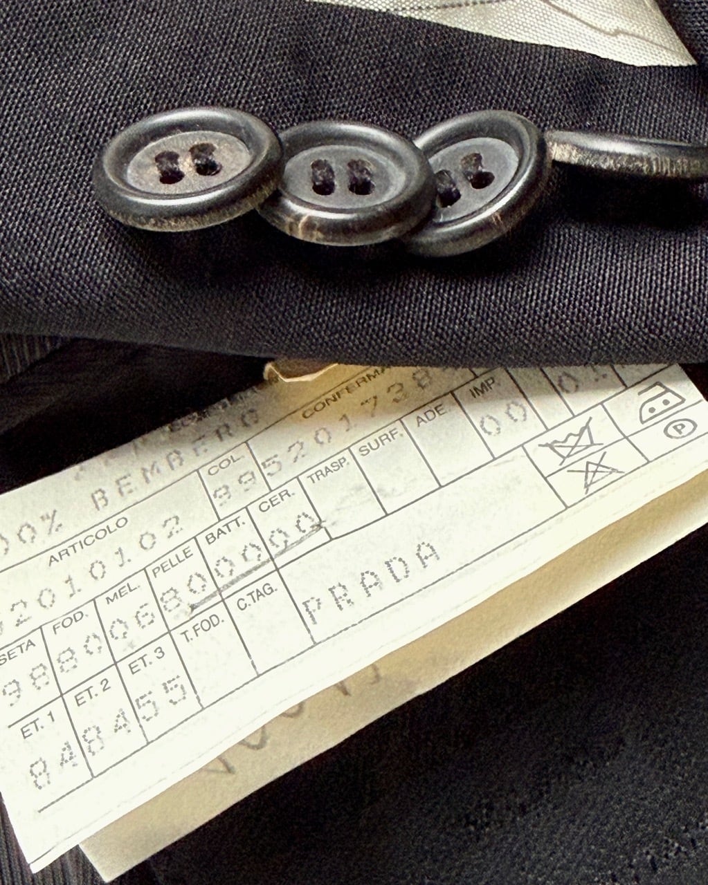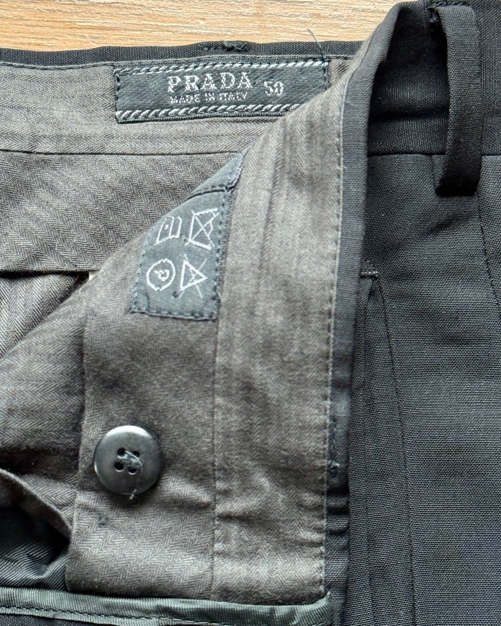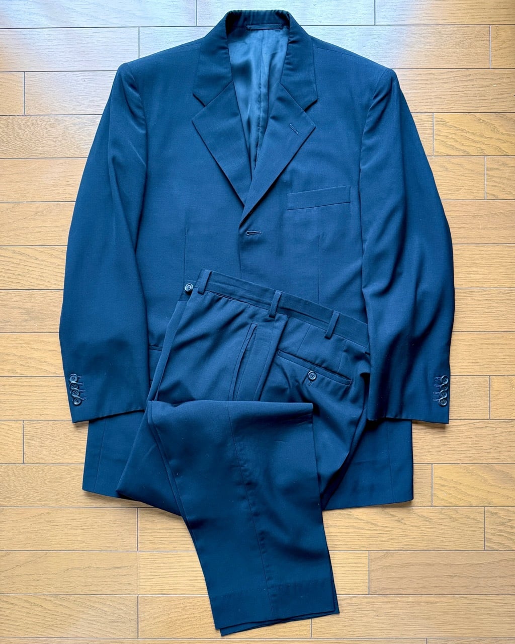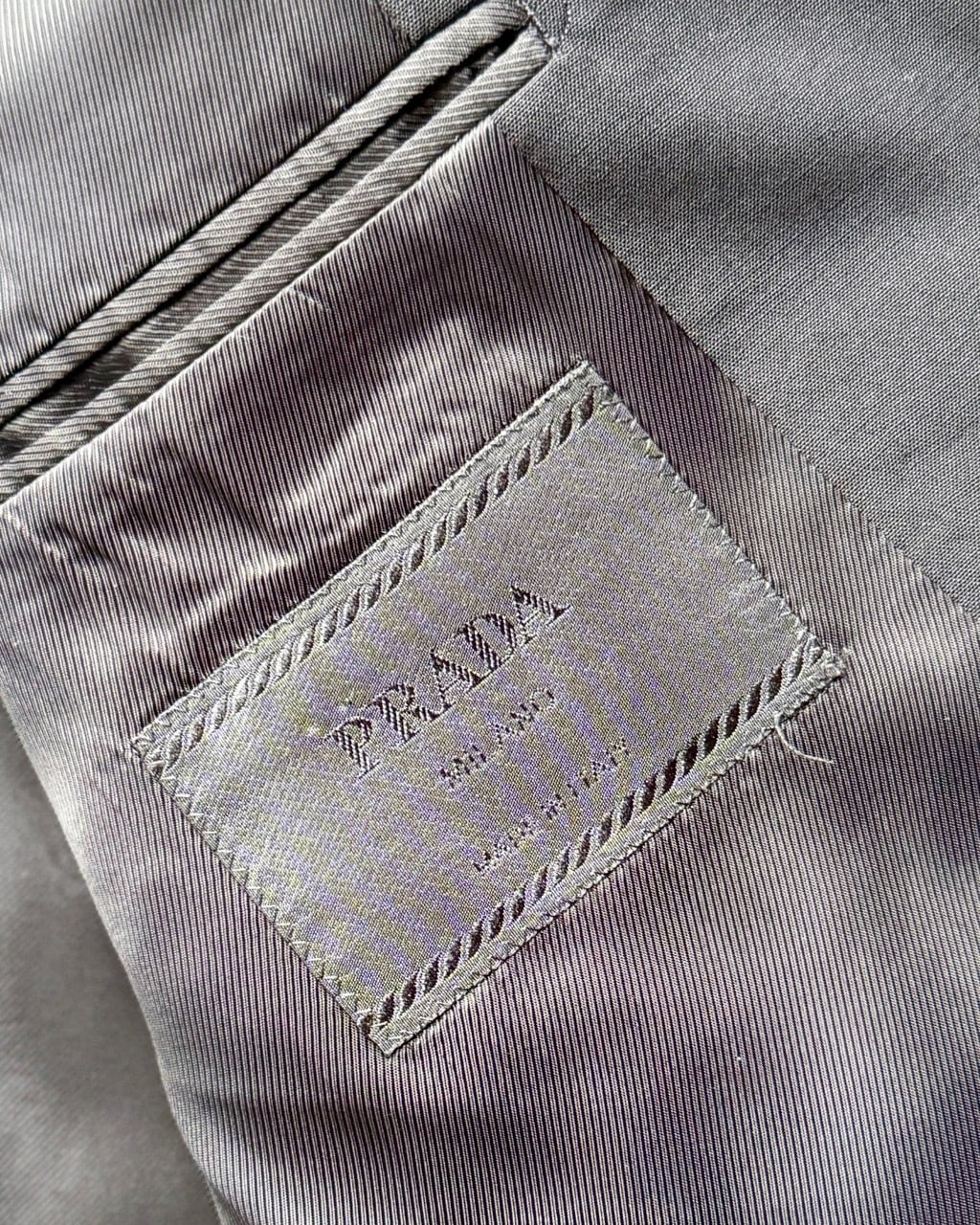 GW公開予定のプラダを着た悪魔2で再び話題となっているプラダからメンズスーツの紹介です。こちらは以前ベルベストとカルーゾがプラダをスーツを請け負っていた時代のスーツとなります。生地はストレッチ素材ではなくウール100%。縫製はカルーゾと思われます。モード系スーツながらパンツはボタンフロンド、ジャケットの袖は本開きの本切羽とサルトリア志向の強い仕上がりです。ジャケットはVゾーンの狭い細身のシルエット、イタリアでは珍しい総裏仕上げになっています。シンプルなプレーンフロントの組下と相まってミニマルな装いが似合います。