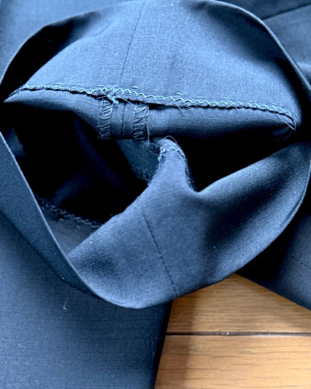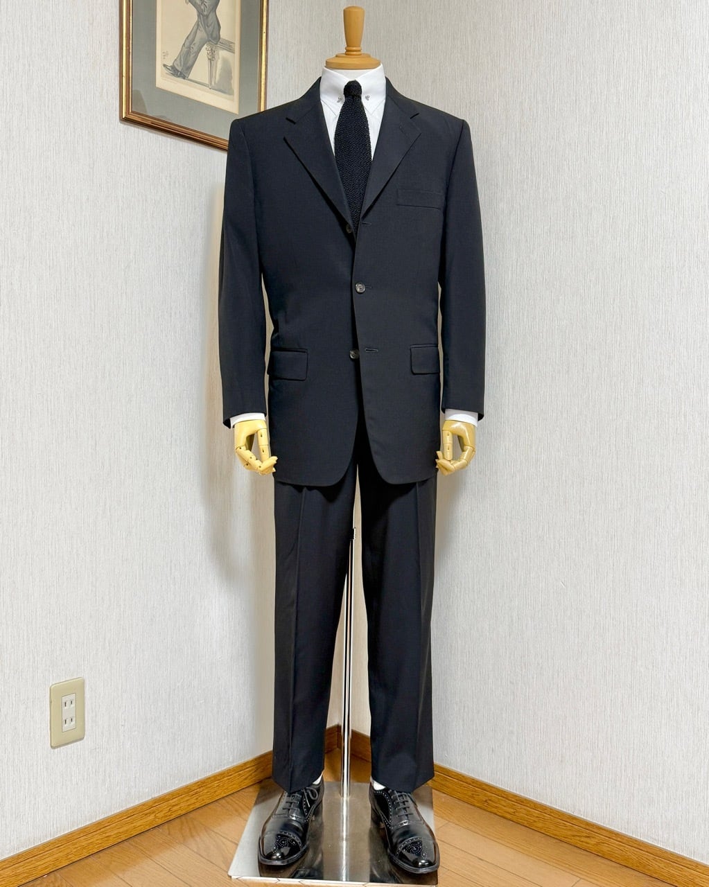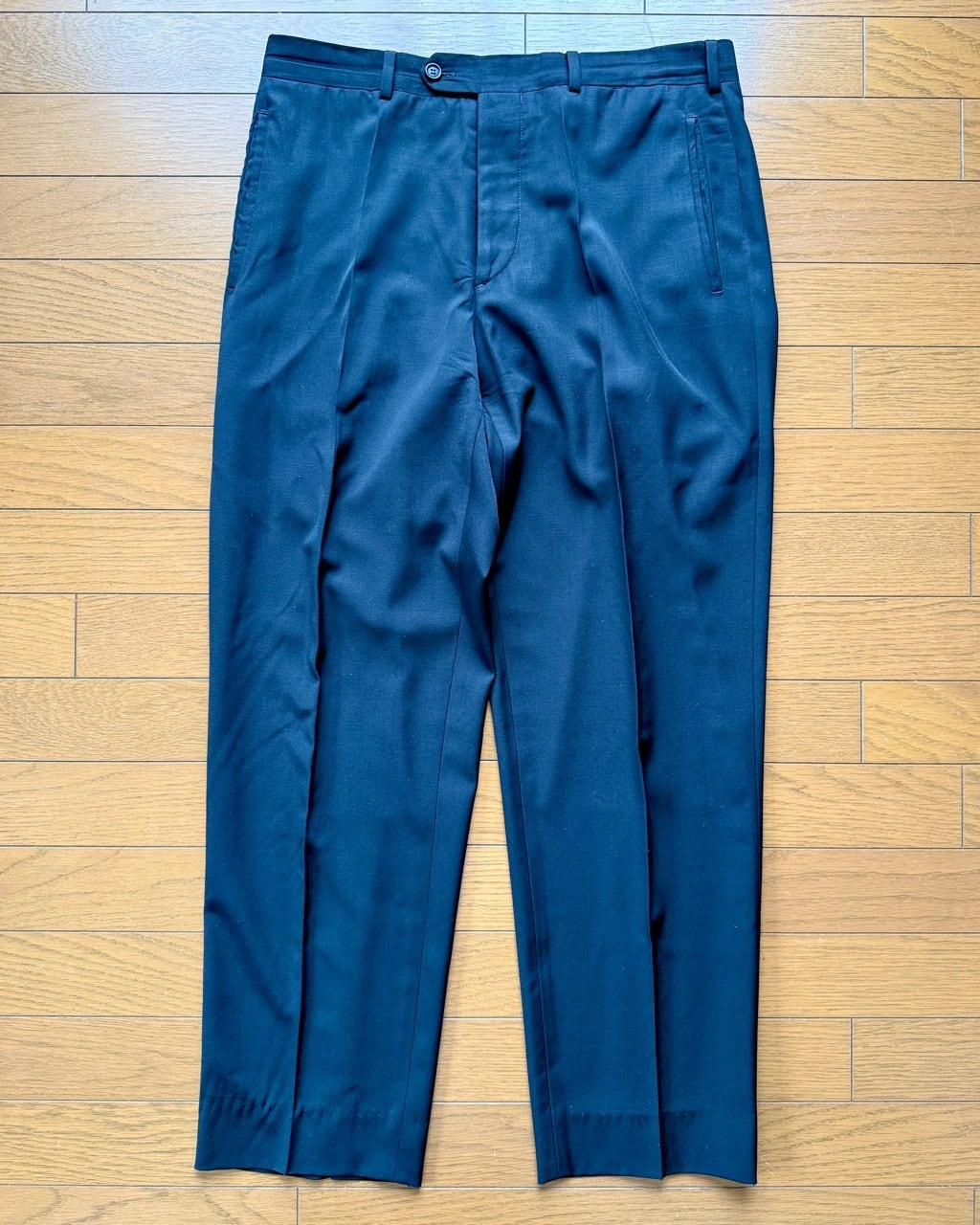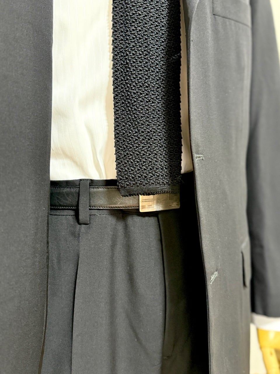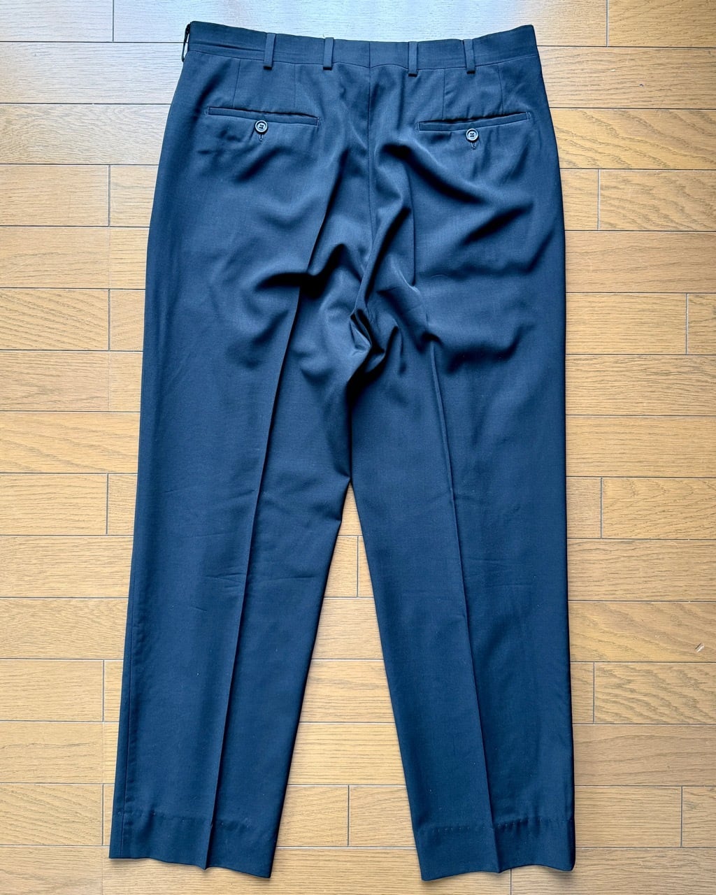 GW公開予定のプラダを着た悪魔2で再び話題となっているプラダからメンズスーツの紹介です。こちらは以前ベルベストとカルーゾがプラダをスーツを請け負っていた時代のスーツとなります。生地はストレッチ素材ではなくウール100%。縫製はカルーゾと思われます。モード系スーツながらパンツはボタンフロンド、ジャケットの袖は本開きの本切羽とサルトリア志向の強い仕上がりです。ジャケットはVゾーンの狭い細身のシルエット、イタリアでは珍しい総裏仕上げになっています。シンプルなプレーンフロントの組下と相まってミニマルな装いが似合います。