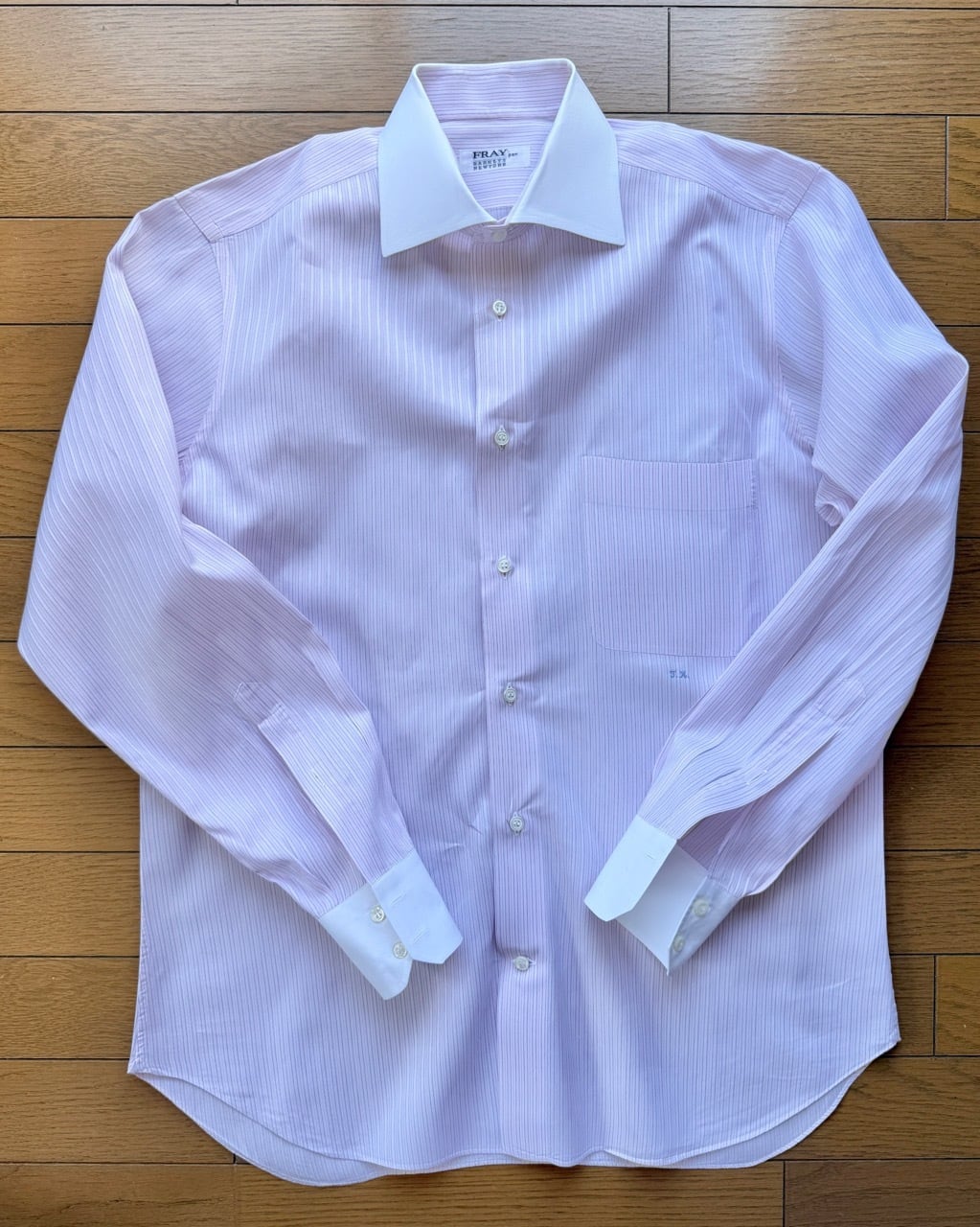 マシンメイドの最高峰シャツ、フライのスミズーラからワイドスプレッドのクレリックシャツ(通称)の紹介です。欧米男性は正装姿にピンクを取り入れるのが上手いと言われます。肌の色に近いということもあるでしょう。特にネクタイやポケットチーフ、シャツなどピンク色のアイテムはこれから春が本番。シャツ生地はスイスコットン、袖先(カフ)も襟と共布で角落ちツインバレルを指定してあります。胸ポケットやその下のイニシャルなどス・ミズーラの名残りが散見されます。
