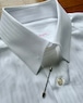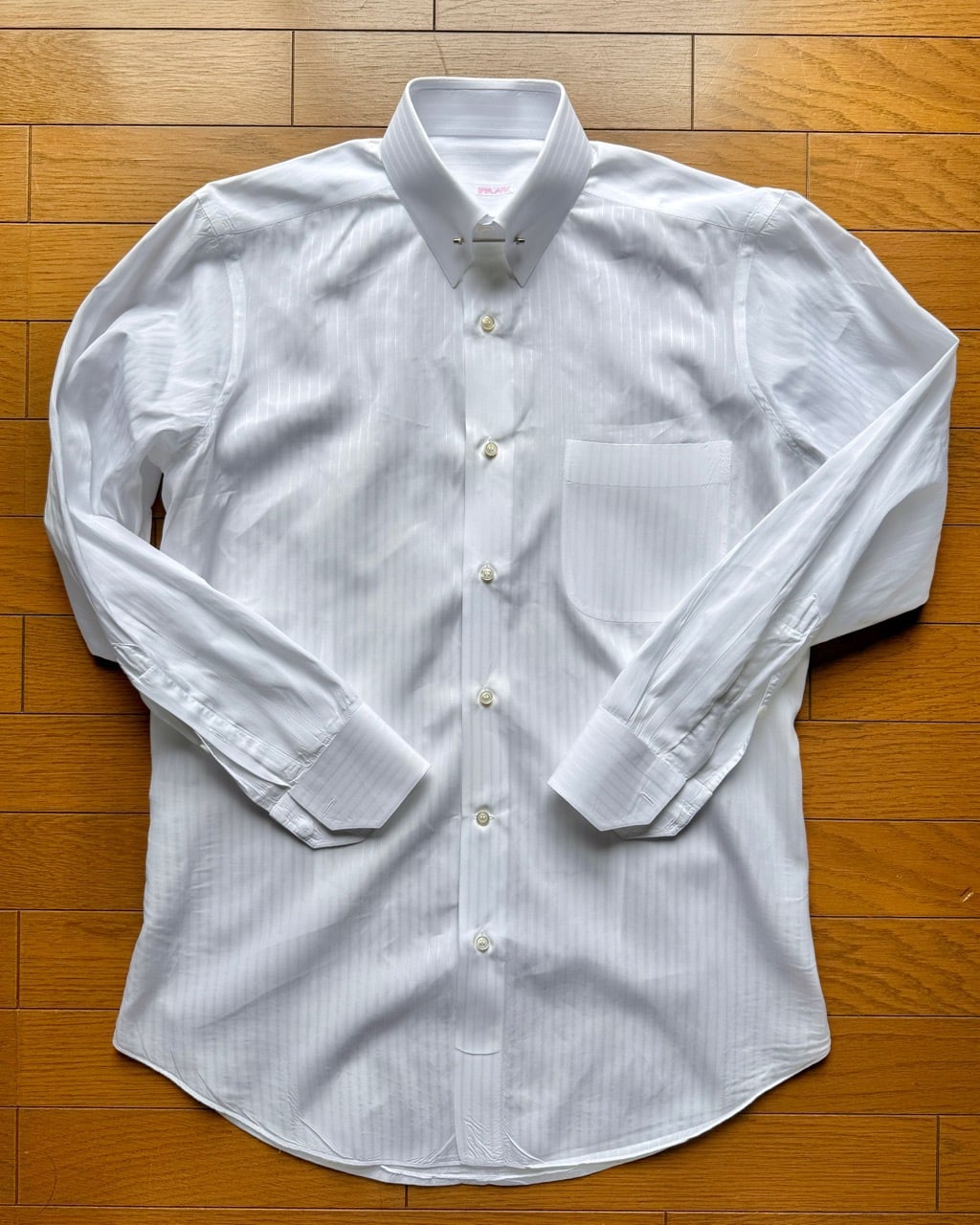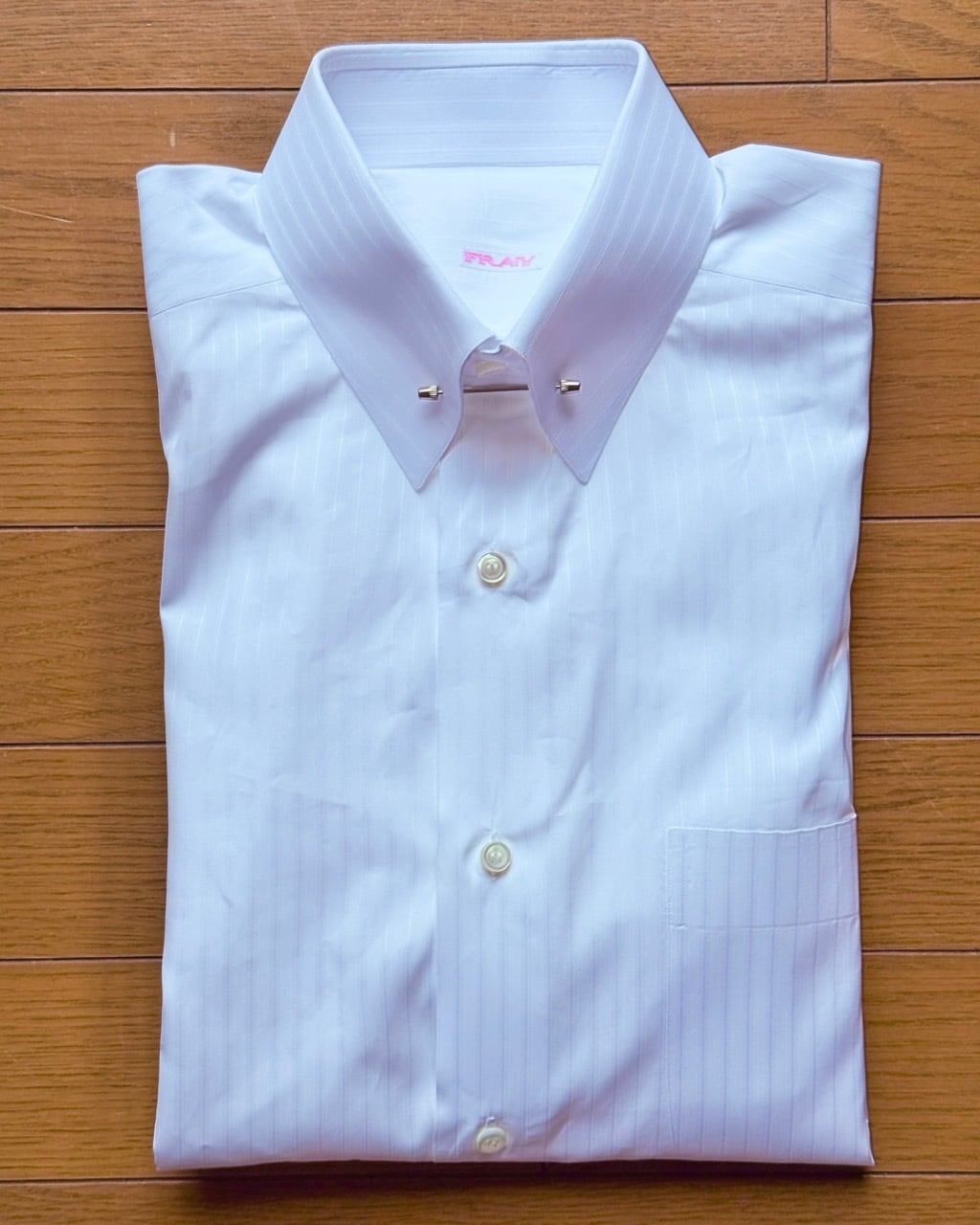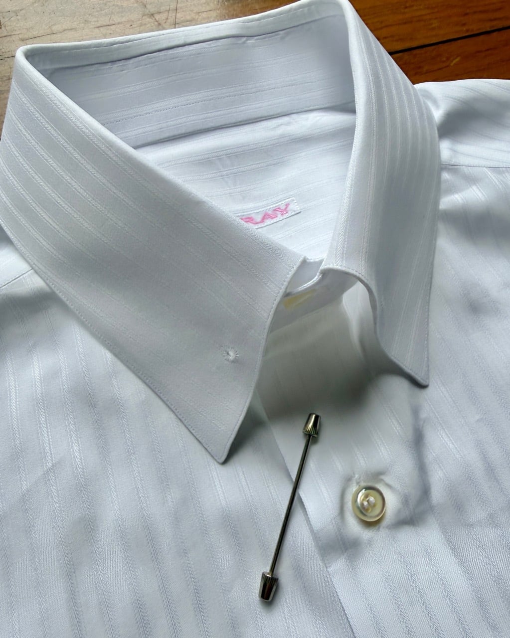 マシンメイドの最高峰シャツ、フライのスミズーラからレギュラーピンホールカラーシャツの紹介です。白のドビーストライプはスイスコットン。立体感のある生地をマシンメイドならではの端正な形に仕上げたシャツです。オーダー品なのでジャケットの下で邪魔にならないよう背中側にダーツを入れたりドレスシャツには付かない胸ポケットを追加したりと店主の好みが反映されています。
