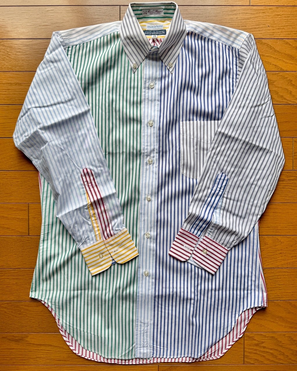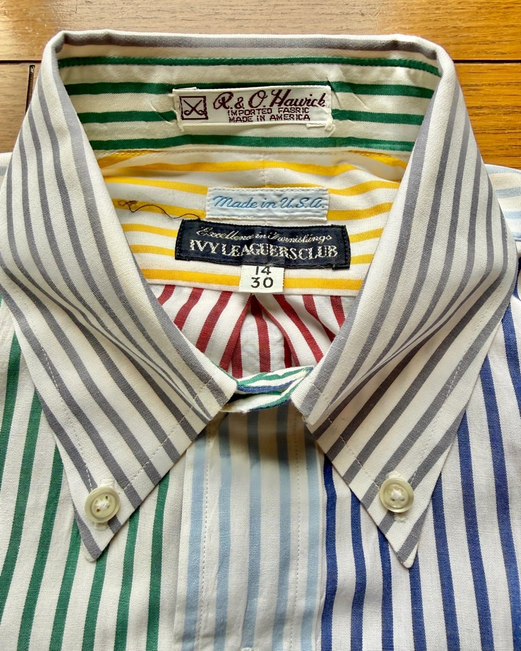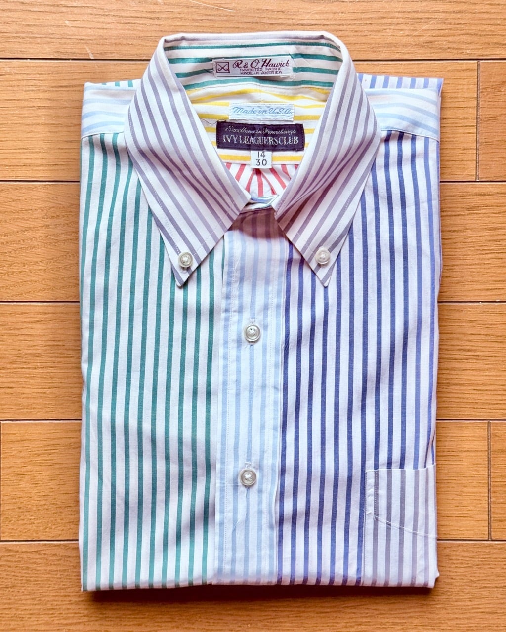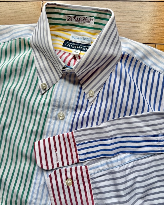 今はなきアメリカの名門シャツメーカートロイのクレイジーストライプシャツの紹介です。ブルックスブラザーズと並んでアイビールックの定番、J.プレスのオックスフォードBDシャツを長年作りづけてきたトロイでしたがギットマンと同じくインディビジュアライズドアパレルグループの傘下に入りブランドは消滅いたしました。タグは日本の服飾ブランドの草分け的存在の三峰が展開していたアイビーリーガーズクラブ、1990年代日本で購入したもので既にビンテージの域に達しているBDシャツです。サイズタグは14/30とあり本来はボーイズサイズと思われますがレティスを想定して販売されたもの、同じメンズの15½-32とペアで着る楽しみがあります。