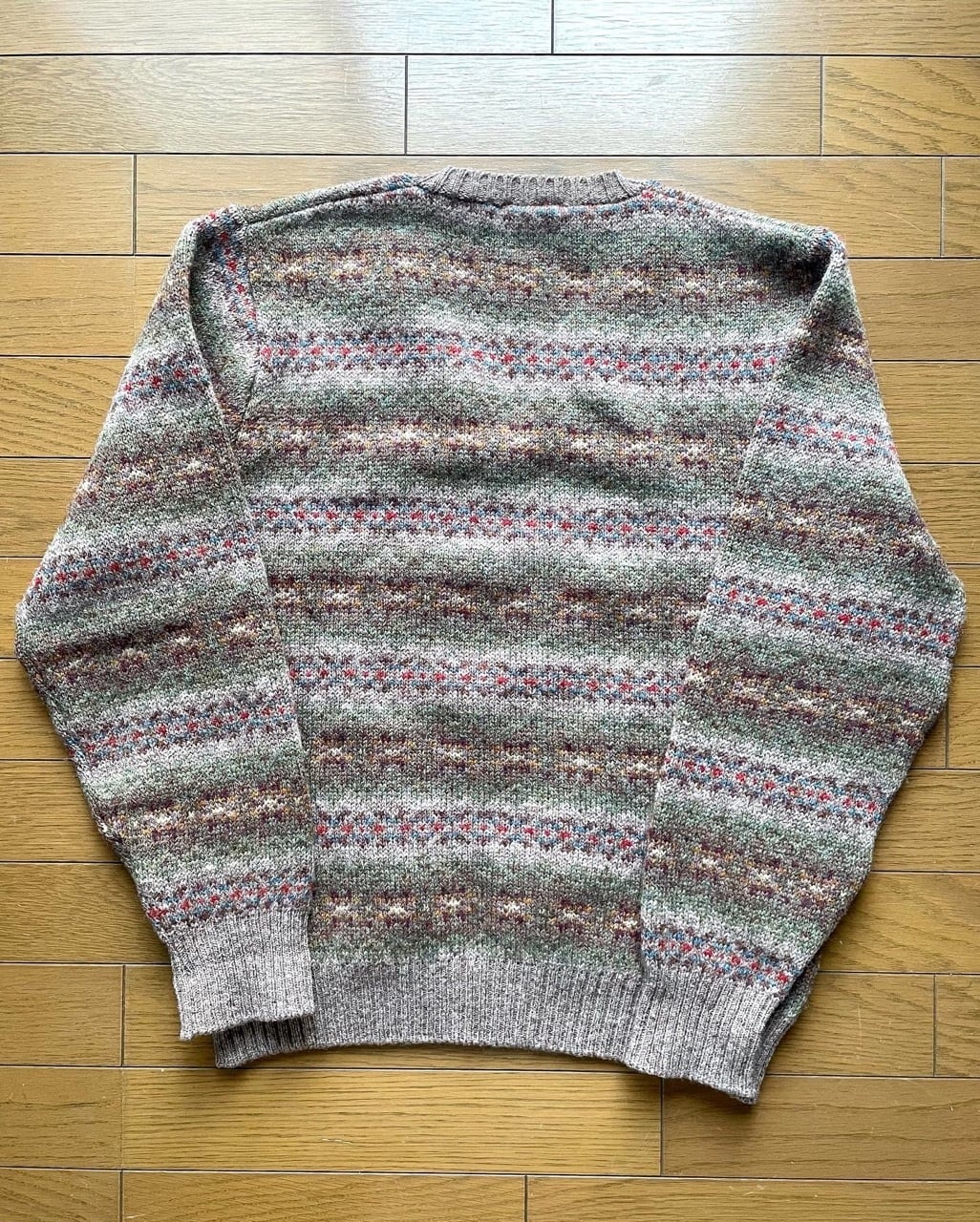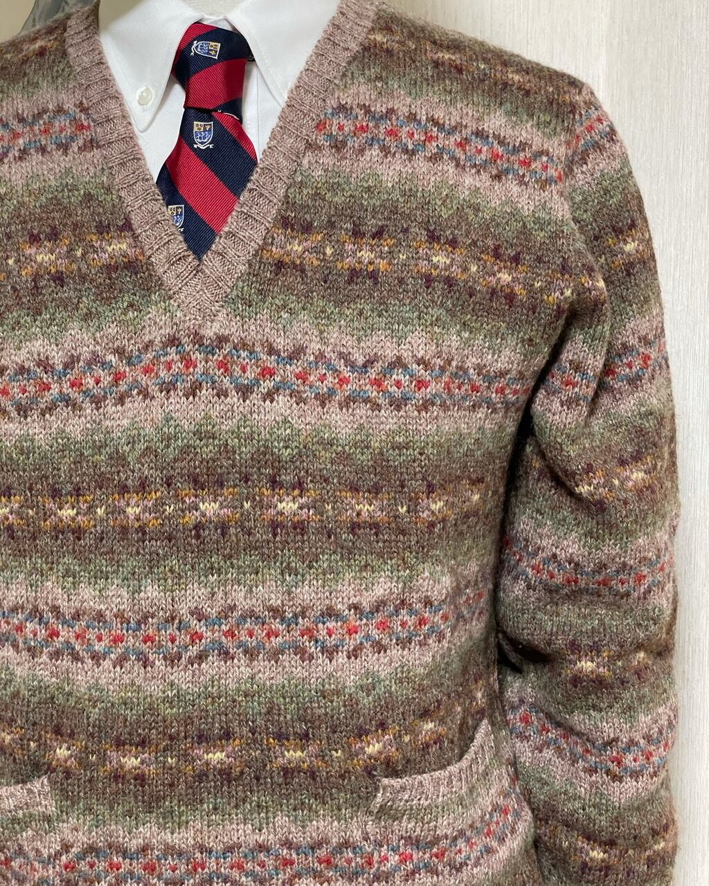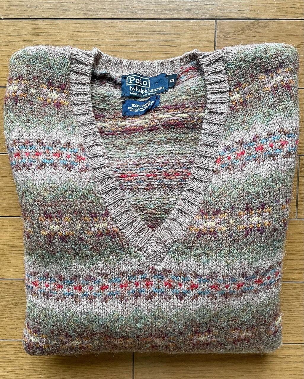80年代初期、中国に専用のハンドニット工場を持つ前のラルフローレンはフェアアイルを英国に発注していました。メイドイングレートブリテンの文字が入る旧タグはレア中のレア、セーター自身もフロントにハンドウォーマーのポケットが2つ付く珍しいデザインとなっています。ラルフローレンのこだわりが詰まった英国製フェアアイルセーターを是非手に入れてみてください。状態は毛玉もほぼなく袖口脇下共に綺麗な状態です。