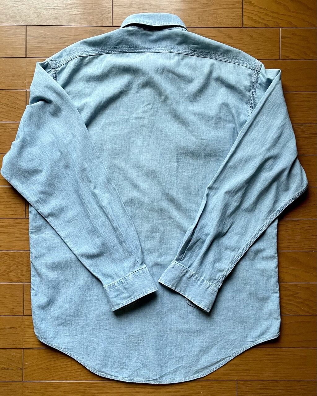 【品番】DRL-U05 【状態】ユーズド 【製品情報】モーリシャス製 【素材】シャンブレー(綿100%) 【表記サイズ】M 【実測値】 身幅60㎝ 肩幅50㎝ 着丈83㎝ 袖丈62㎝ 首周り40㎝ 【商品説明】 タグの3つ星が物語る第1期RRLのシャンブレーワークシャツが入荷しました。入念なウォッシュ加工で年季の入った風合いと着心地の軽さが特徴。10枚目の写真にあるように左袖上腕部に小さな染みが2カ所あります。古着以上に古着らしい第1期RRLを着てみてください。
